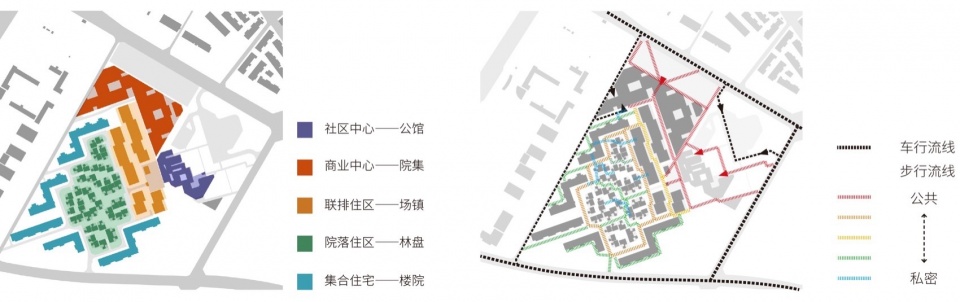 社区外围的联排与商业建筑之间形成了公共性的商街,一端联系商业主入口,一端通往社区人行入口广场,后者由社区寨门和作为游客中心和社区活动中心的公馆围合而成,并设有戏台,是社区最为公共的开敞活动场所。在此处,邻里之间、居民和游客可共同开展商业和休闲活动。