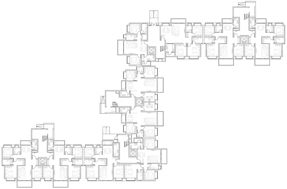 以林盘作为历史参照,在地块中心设置了由五个组团组成的独栋院落住区。各组团通过独栋建筑的错落布局围合出一个内部的半私密围院,各住宅向内开口通过围院间接与社区主要步道联系,塑造了一个具有稳固社区关系的居住组团。独栋院落式住宅设有两种面积段套型(117㎡和88㎡),与红砖和灰砖两种色彩进行组合,每栋均为独立户,以高度的集成单元化形成丰富的外部空间形态。