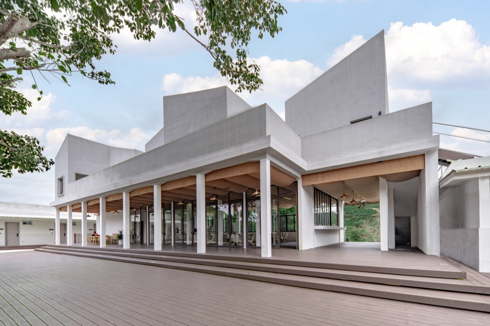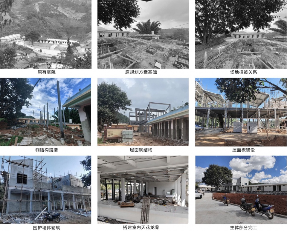 During the site survey, the foundation pits for the steel structure columns of the building were already formed. The original planning placed the living room between the former primary school classrooms and dormitories, creating a linear spatial layout but also separating the courtyard landscape from the surrounding mountainous natural forest. Thus, the design of the coffee lounge emerged as an element to connect the site.