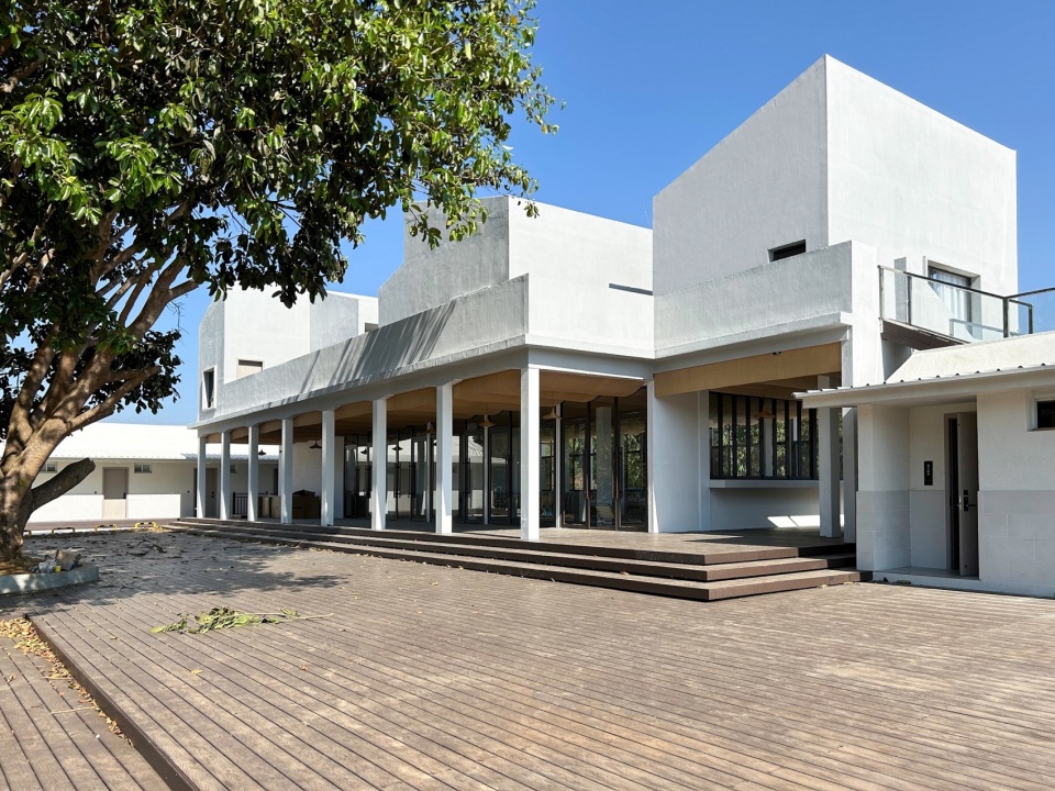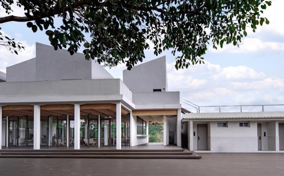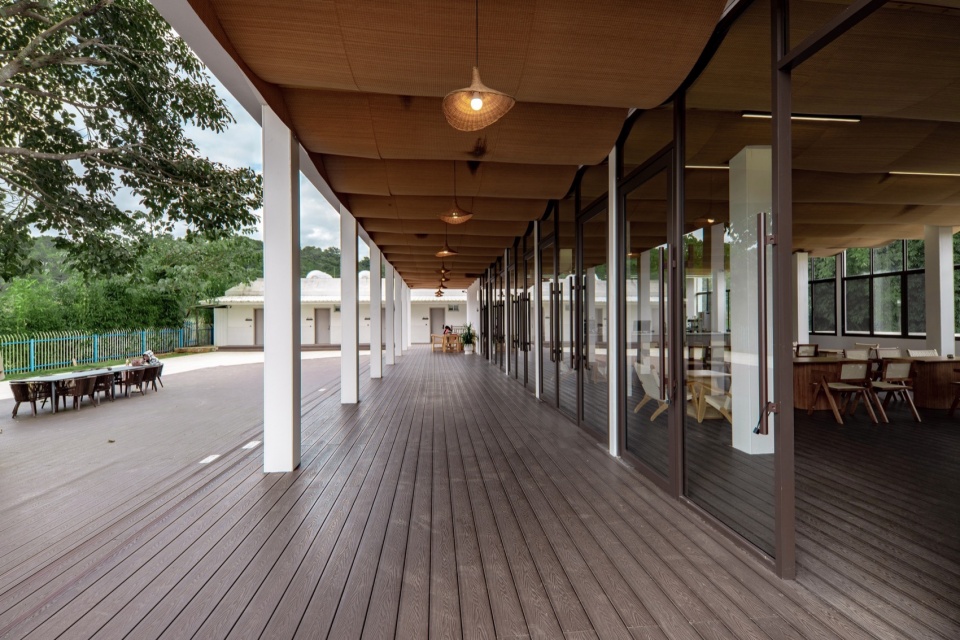 The facade space of the building integrates with the overall courtyard. The first-floor space uses wood-plastic flooring to connect with the outdoor courtyard space, complemented by white columns and transparent glass windows to form a white floating volume that harmonizes with the surrounding original buildings. The wall material is selected with vertical textured real stone paint, giving the overall building a white stone appearance against the green forest when viewed from a distance, and adding a delicate texture to the overall space when viewed up close.