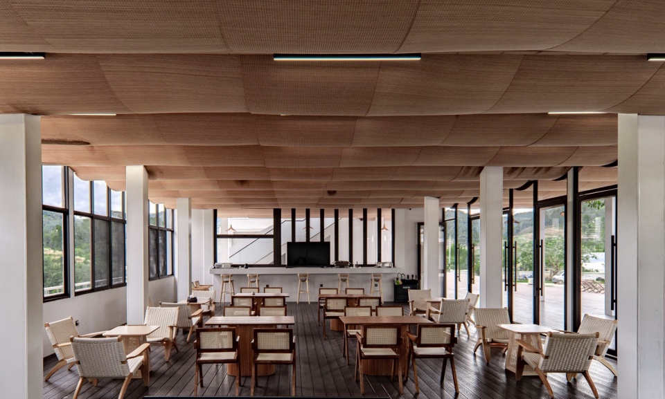 In the project design, we created a circulating flow line inside the coffee bar through the connection between the coffee bar and the veranda, increasing the possibilities for multi-angle experiences within the space. We used steel columns inside the coffee bar, combined with a bamboo woven suspended ceiling, to form a layered arc on the east-west interface, creating a unique framed view with the veranda bar space. The north-south interface features continuous arcs and straight lines of the platform, harmonizing to guide the sightlines between people, the courtyard, and the natural landscape.
