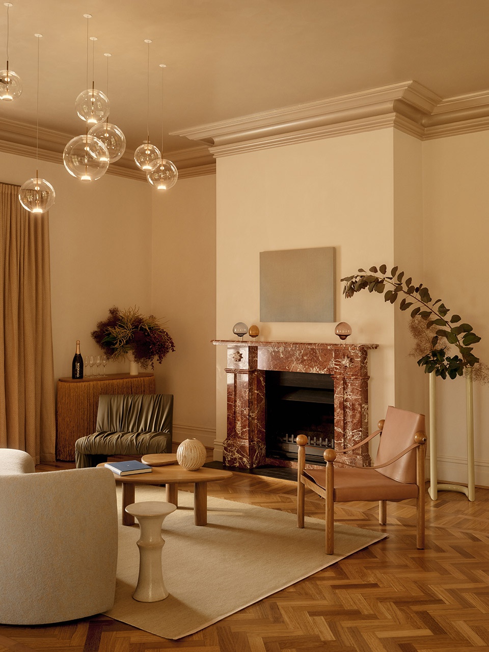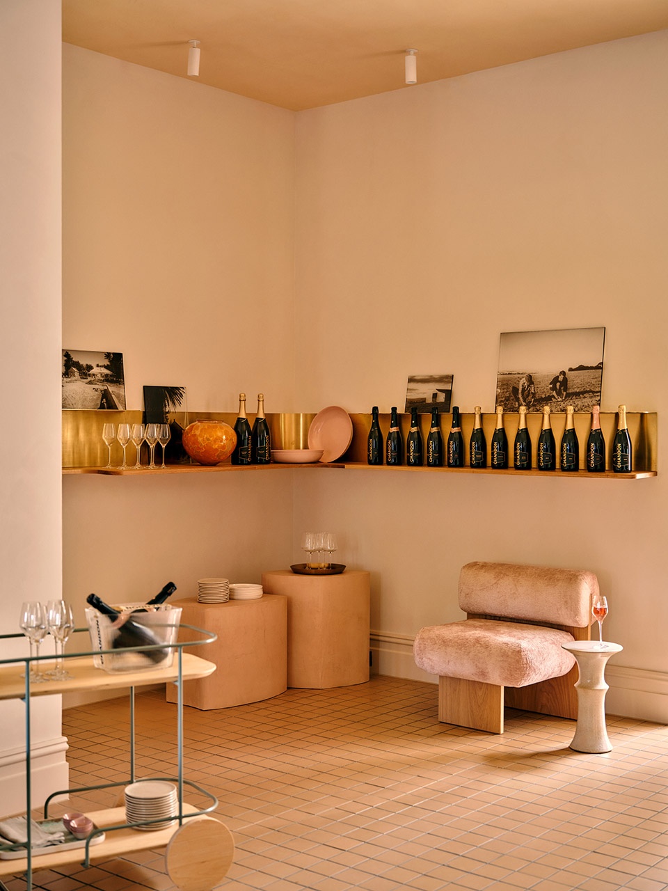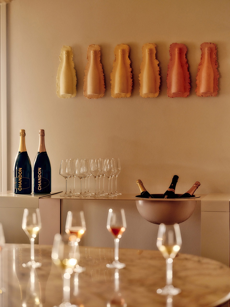 We reimagined the interior of the former 1880’s Green Point homestead, focusing on three key spaces offering different experiences; the entry reception and retail space, the Green Point Lounge for larger group events and the Vintage Room for intimate tastings and corporate events. Our material strategy consistently featured raw textures and warm earthy tones reflecting the sandy, clay and red volcanic soil of the area, contrasted with reflective and sleek finishes that mirror the refined nature of the brand’s winemaking and curated experiences. Part of the brand’s intent for the homestead experience was to feature the work of local artists and makers throughout. We facilitated these collaborations by engaging makers whose medium or subject matter relate to the Chandon Australia ethos. From Emma Shepherd’s custom handwoven wall hanging depicting the local Yarra River, to Kristin Burgham’s plaster casts of Chandon sparkling bottles, the presence of art is part of the storytelling experience.