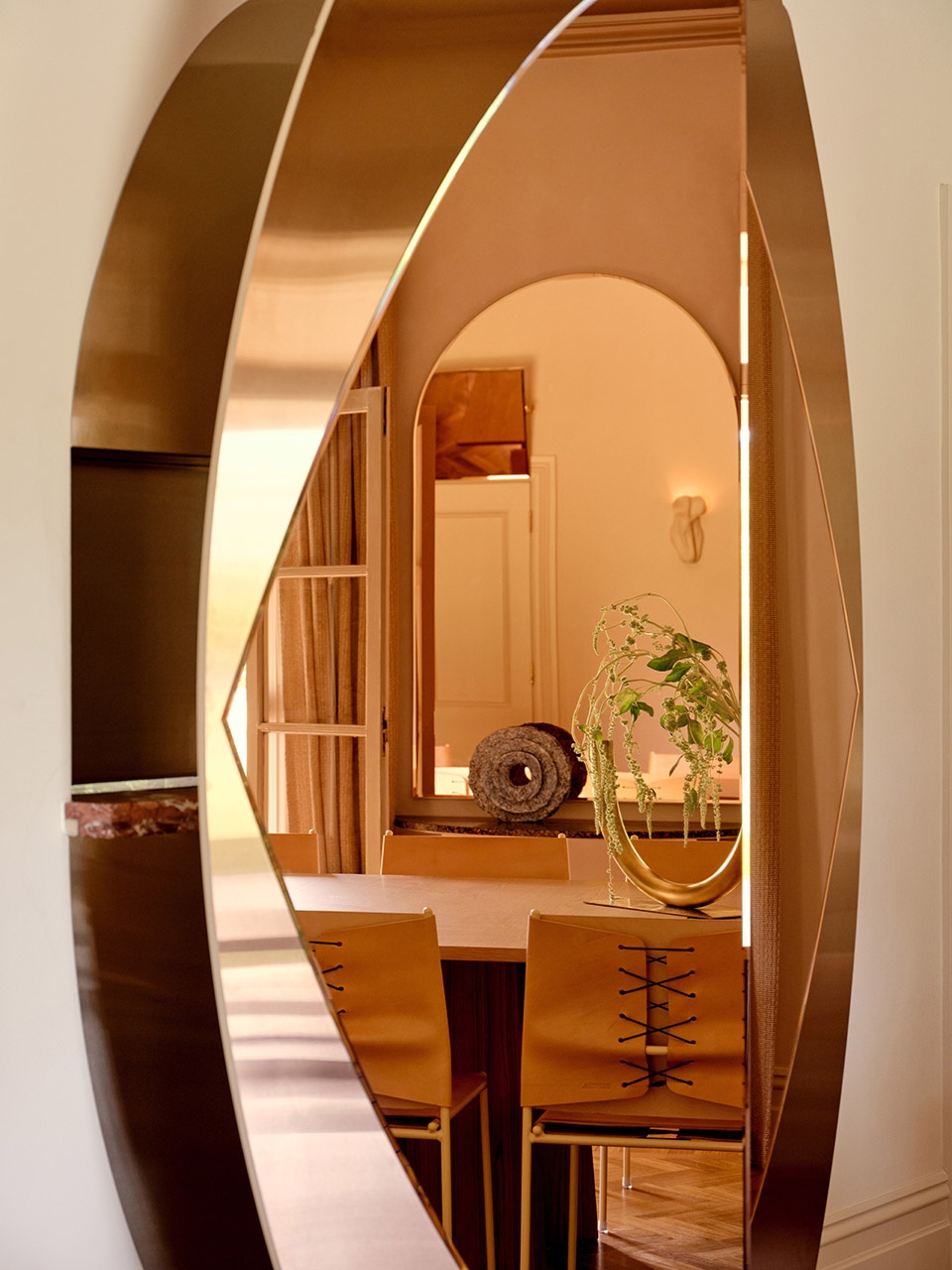 设计的创新之处在于空间功能与氛围的层次构建与关系编排。作为Chandon希望来宾“宾至如归”的体验承载体,我们将功能性空间需求融入一个温馨、居家的氛围之中,使招待与企业活动都能自然流转于宅邸之中。这种感受的塑造基于一系列温暖且具触感的材料为基础,并叠加布艺、艺术品、绿植、柔光及弥散的香气,构成完整而充盈的感官体验。在这一过程中,我们发现将功能逻辑与情感象征(例如熟悉感)交织,是构建宽厚、舒适与难忘空间体验的关键。这种功能与氛围的融合同样体现在我们为 Green Point 酒廊定制的吧台设计上:旋转的镜面屏风让备餐过程灵活地成为活动体验的一部分,在不同情境中实现空间的动态转换与仪式感叠加。