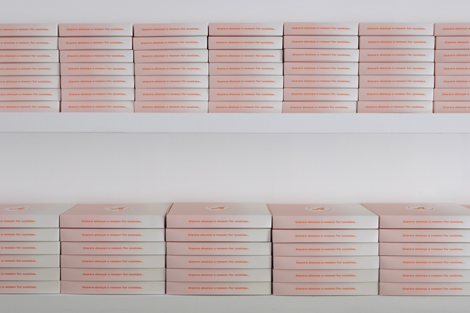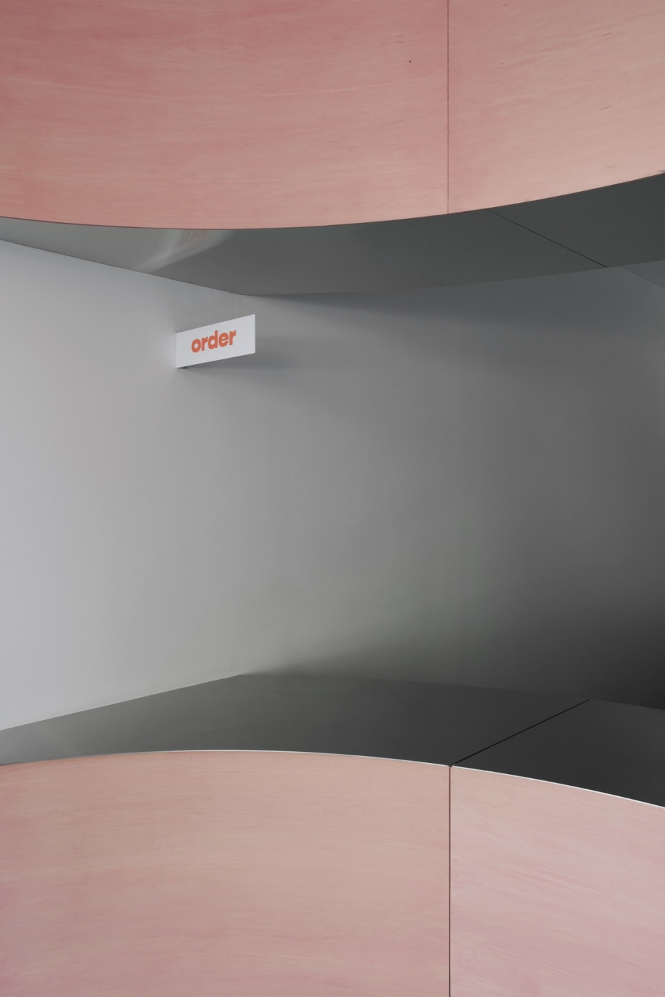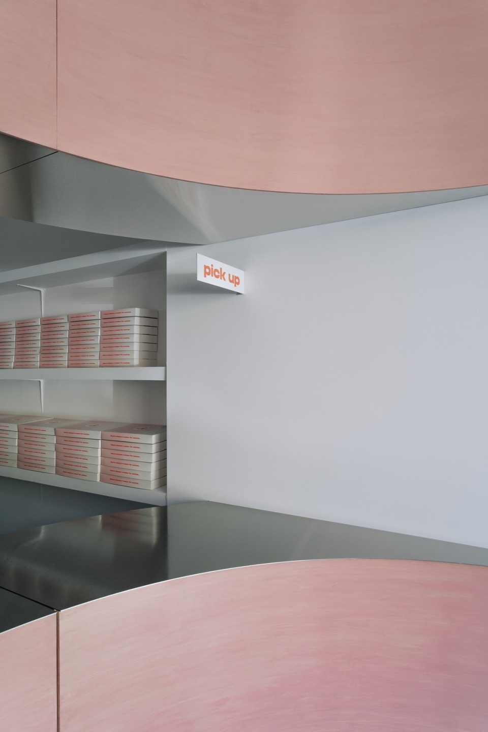曲面构件采用夹板包覆,并以品牌标识色——定制的柔粉色染料进行处理,由StudioAC一并负责设计。这些柔和的粉色曲线与不锈钢吧台和吊顶形成鲜明对比,突出了顾客区域与烘焙区域之间的分界。此外,店铺的包装设计也延续了这一品牌视觉,采用相同粉色的渐变效果,包装在堆叠时更增强了店铺整体的视觉吸引力。