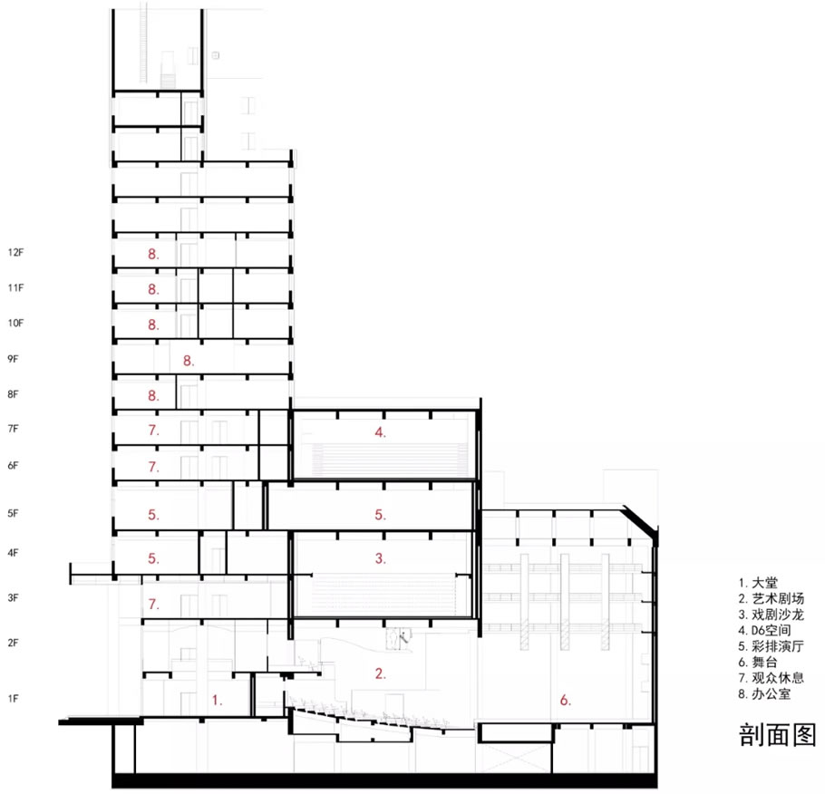 通过对现状建筑细致的调研分析,逐一发现并解决现有建筑功能和规范上的问题,在有限的空间实现腾挪、疏通与提升;挖掘和强化原有建筑叠、分、合的空间特征,三个剧场在建筑声学上相互分隔,但在空间上加强关联性。