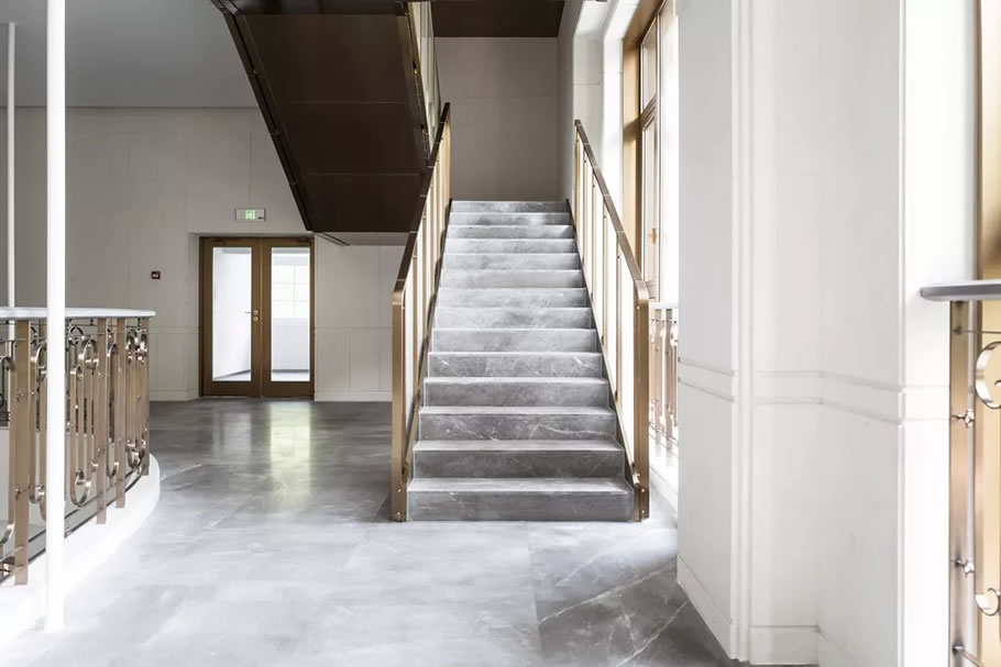 本次修缮梳理出建筑的时间刻度线,并寄旧于新。话剧大厦原有的装饰艺术风格得到延续,新的创作容纳老的剧场元素。一些具有特殊纪念意义的老部件被完好保留或者另做新用,一楼大堂朝向安福路的旋转门处有一块直径2米的圆形拼花石材铺地,是上海话剧艺术中心每年30多万观众的必经之路。这块具有纪念意义的地面被完好地保留下来继续使用,过去和未来在“旋转”之间相互辉映。