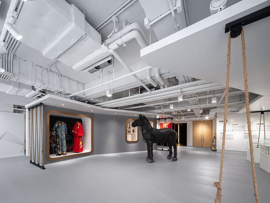 各剧场外侧的等候厅之间原先相互隔离,设计通过新增两部“时空楼梯”串联上下楼层的公共空间,每个厅同时也承载了展示功能,通过与话剧相关的展陈,诸如服饰、道具、舞美模型,以及实验性的装置艺术赋予空间“示范性”与“传播性”等多重属性。