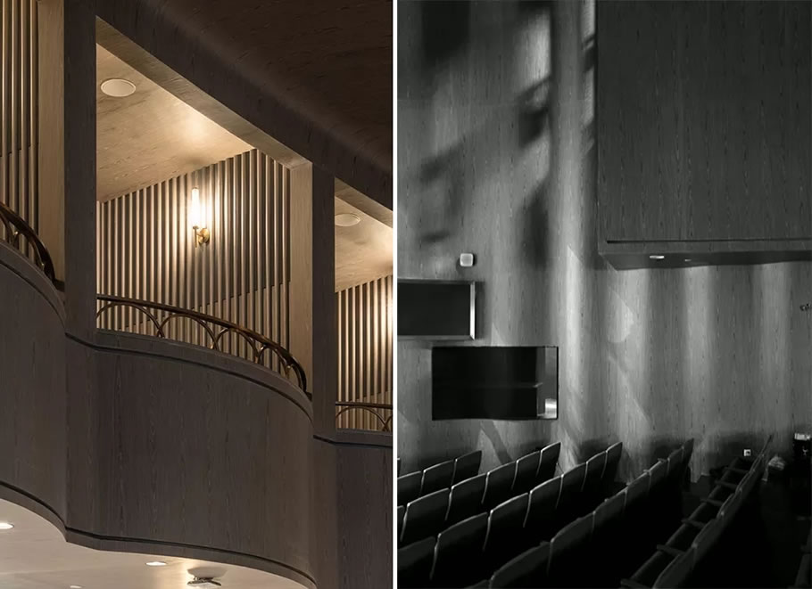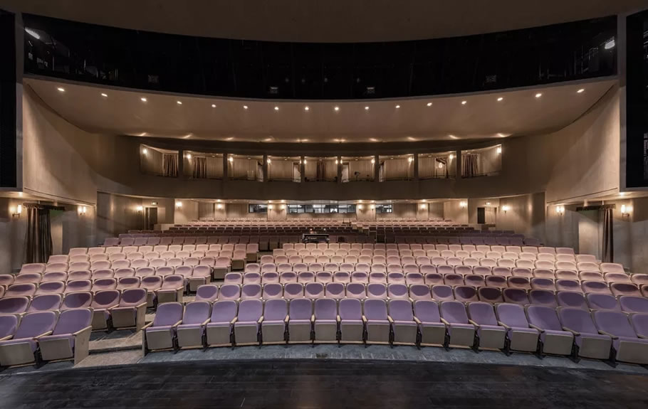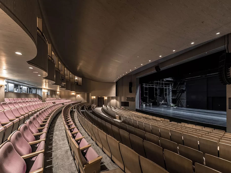 The wrapped inner surface design of the auditorium cleverly extends the form change of the curved box to the side walls on both sides of the pool seat. In addition to the consideration of form, it is more important to improve the uniformity of the sound field and adjust the appropriate reverberation time, so that every seat in the auditorium can obtain the language clarity necessary to enjoy the drama.
