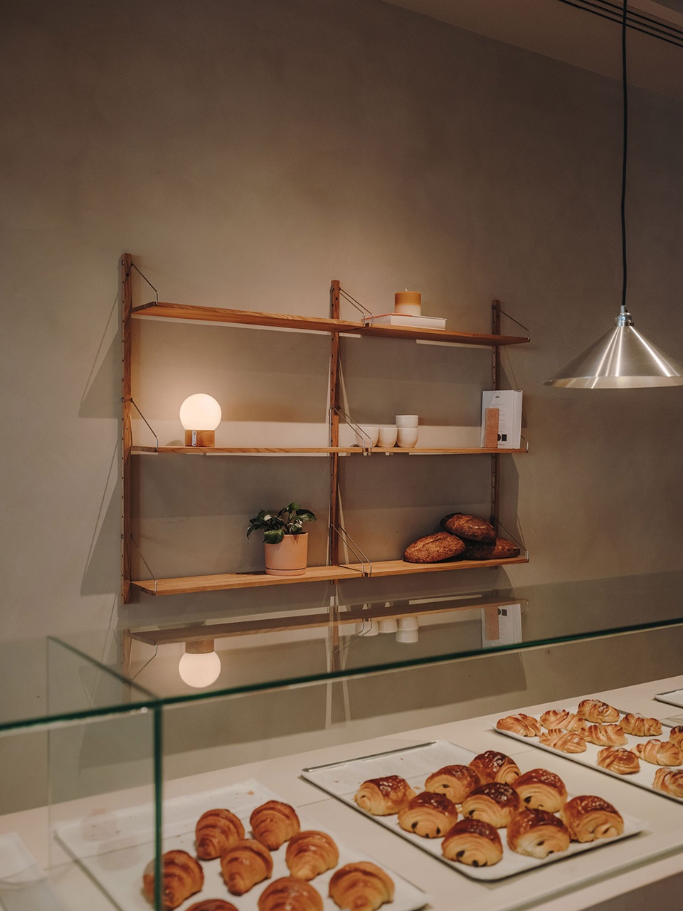 大地色系建筑涂层呼应了小麦的自然色调,而手工涂抹的生态黏土墙面则带来独特的细腻肌理与变化。Origo面包坊的尽头设有一个类似“广场”的共享空间,顾客可在配有Frama高脚凳的微水泥吧台试吃产品,或在一张超大操作台边就座,通过大玻璃窗观察烘焙师的现场操作,形成沉浸式体验。该区域配备Serax壁灯——造型几何的混凝土灯具,为空间增添雕塑感。