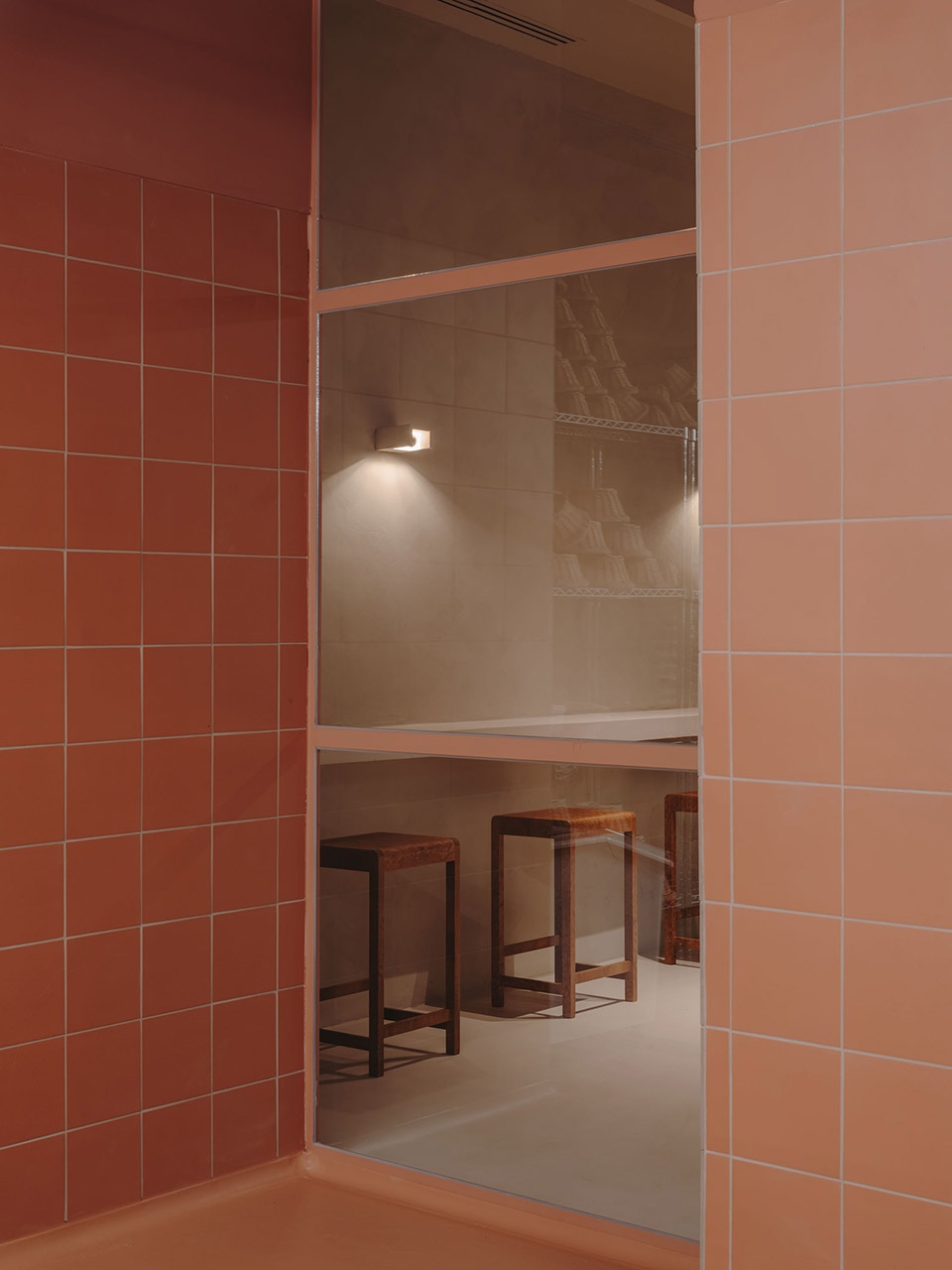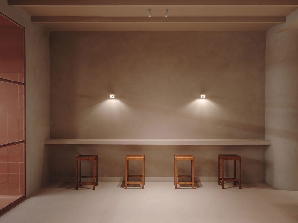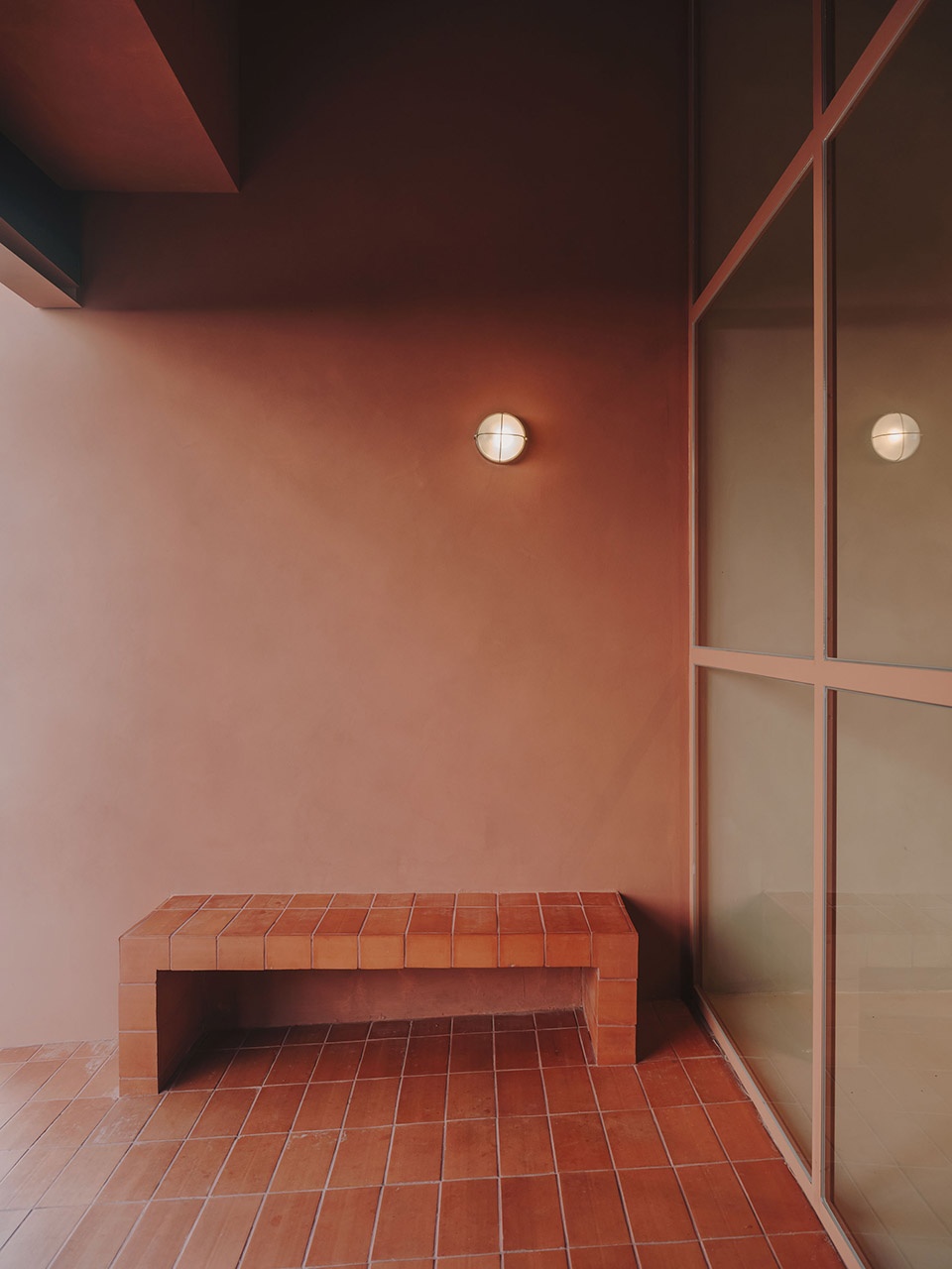 标志性的陶土色不仅定义了室内氛围,也延伸至入口区域。步入前,访客会先经过一个小型的户外空间,地面与长凳铺设陶土砖,墙面也使用同色调的肌理涂层处理。