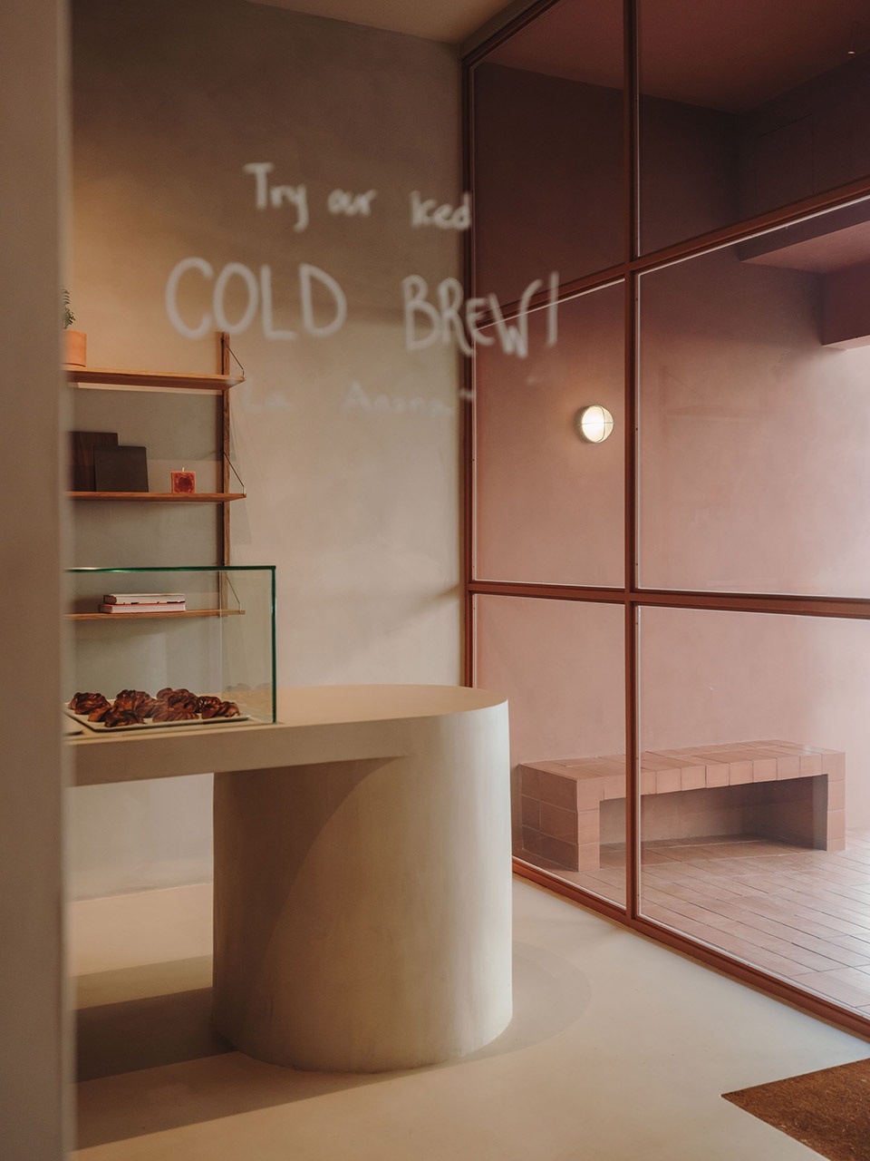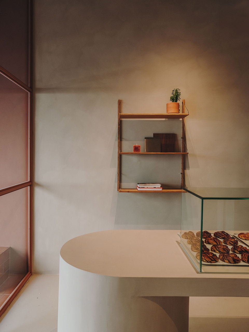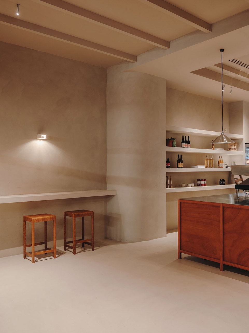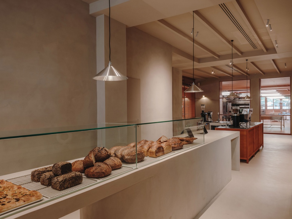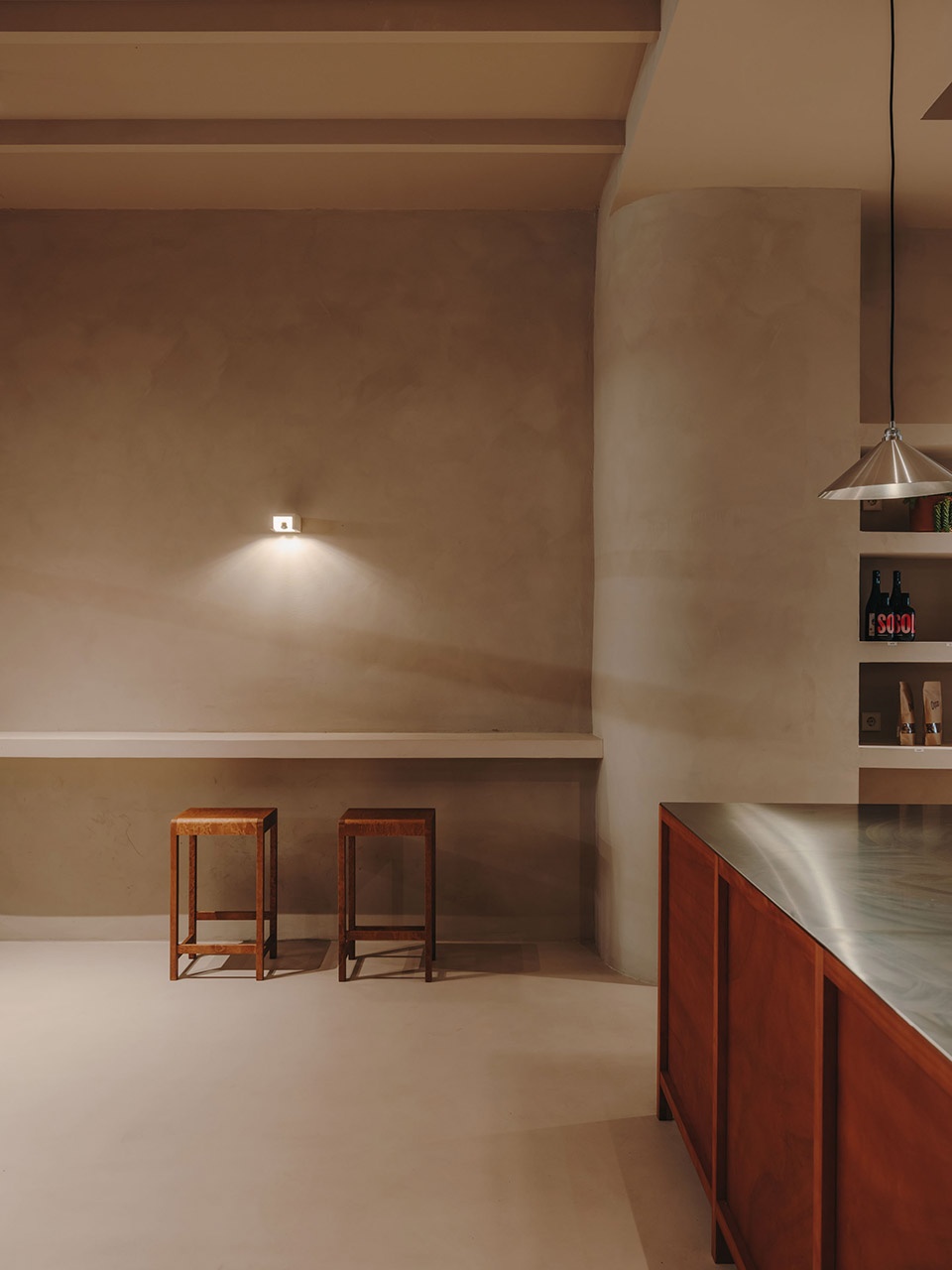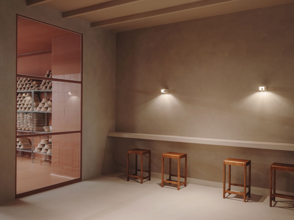 The single-color architectural layer in earth tones evokes the color of wheat, while the ecoclay walls, applied manually, add texture and unique nuances. At the end of the store there is an agora where users can try the products, either in a high micro-cemented work bar with Frama stools or in a large work stand with large windows that allow them to observe the bakers in action, creating a immersive experience. This area is illuminated with Serax sconces, a concrete luminaire with a very geometric shape.