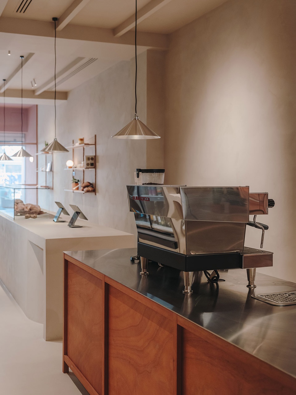 狭长的空间形态是该项目的一大挑战,设计团队将其转化为机遇:一条修长而醒目的建筑展示台成为空间的核心元素,用于陈列所有面包与糕点。其旁是一座由染色伊罗科木与不锈钢台面打造的咖啡吧台,旨在营造出温暖氛围,并与整体环境和谐融合。空间上方悬挂着由Frama出品的六盏不锈钢吊灯,为空间注入柔和的光线。