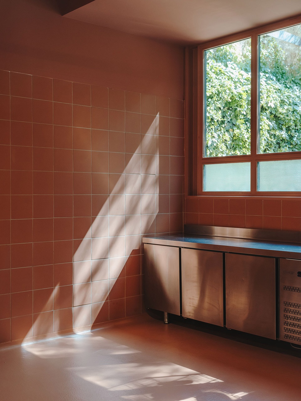 The terracotta color, which defines the interior, also extends to the entrances. Before entering, visitors find a small outdoor area with a floor and bench covered in terracotta tiles and textured walls in the same tone.