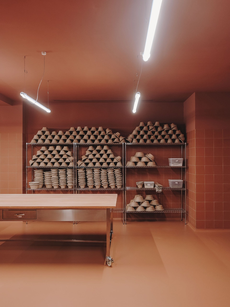 The objective was for visitors to feel part of the workshop. This space stands out for its terracotta tile walls and a terracotta resin floor, full of ovens, mixers and work tables, all of them stainless steel that stand out in that monochrome terracotta tone stain.