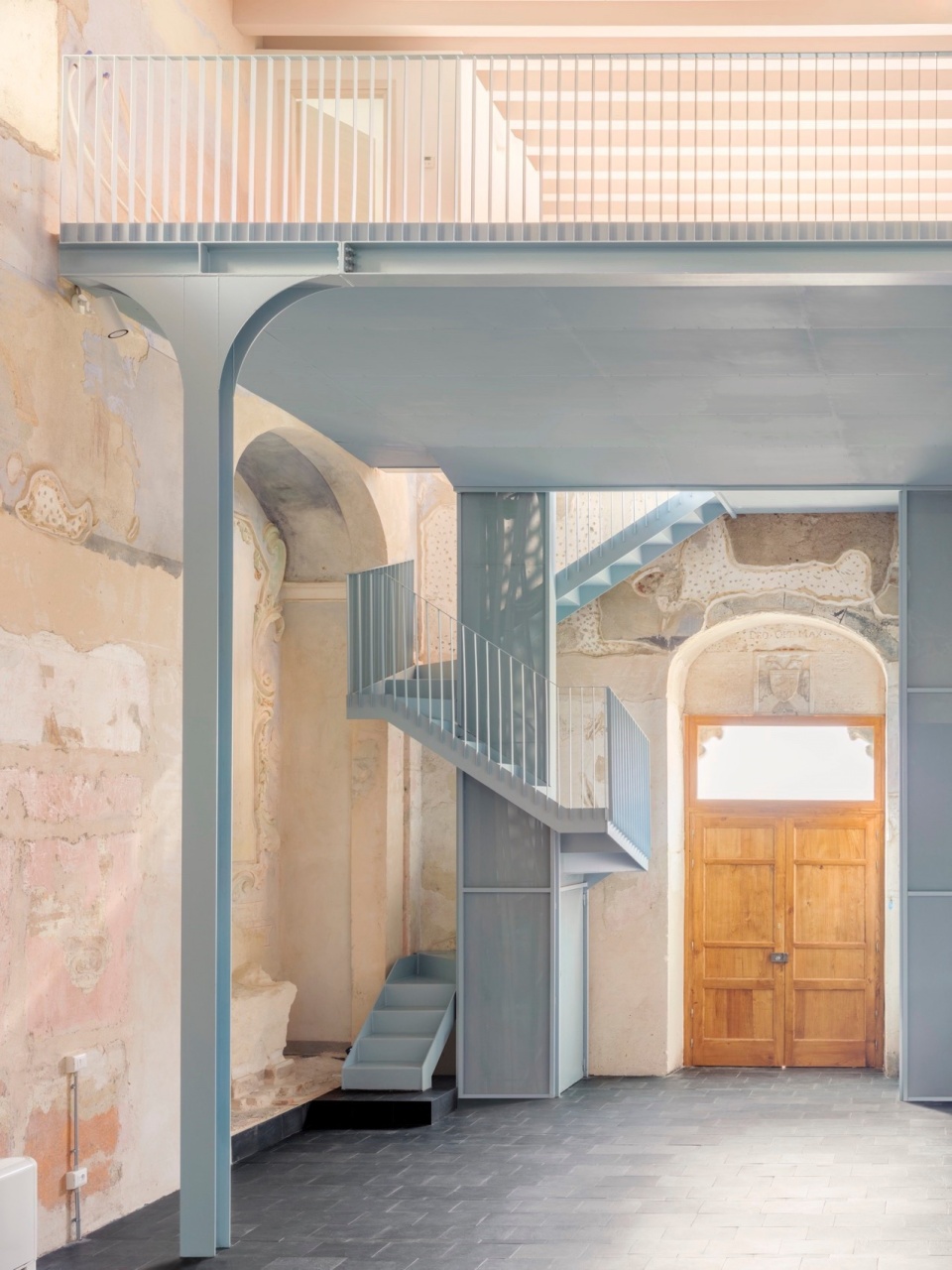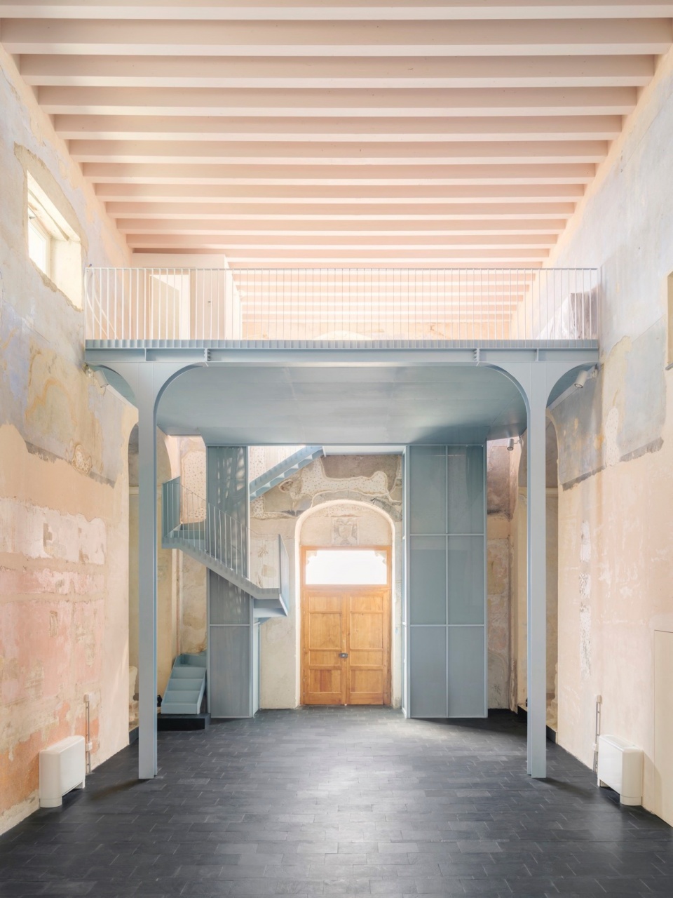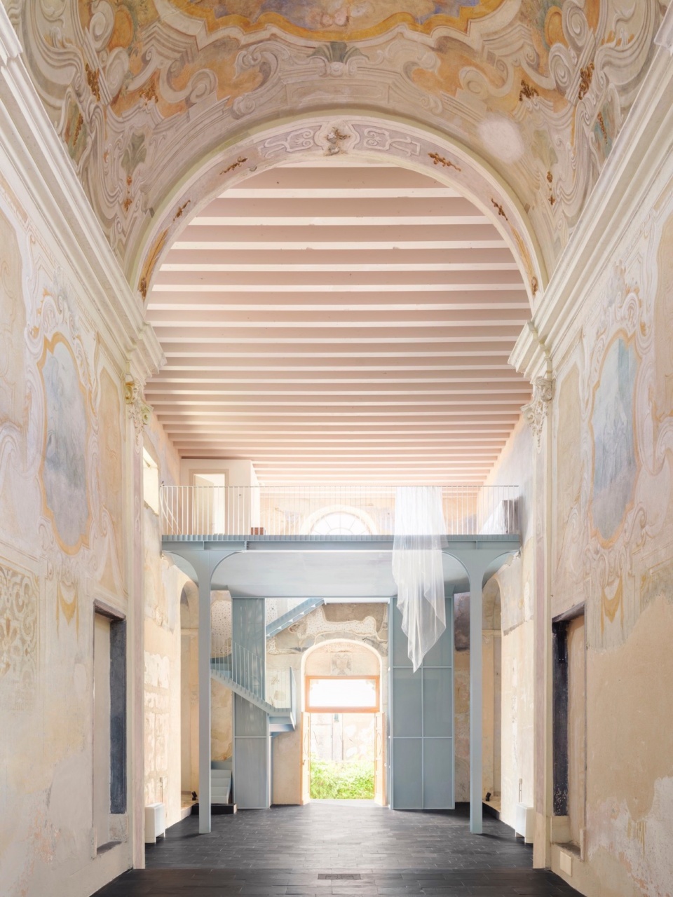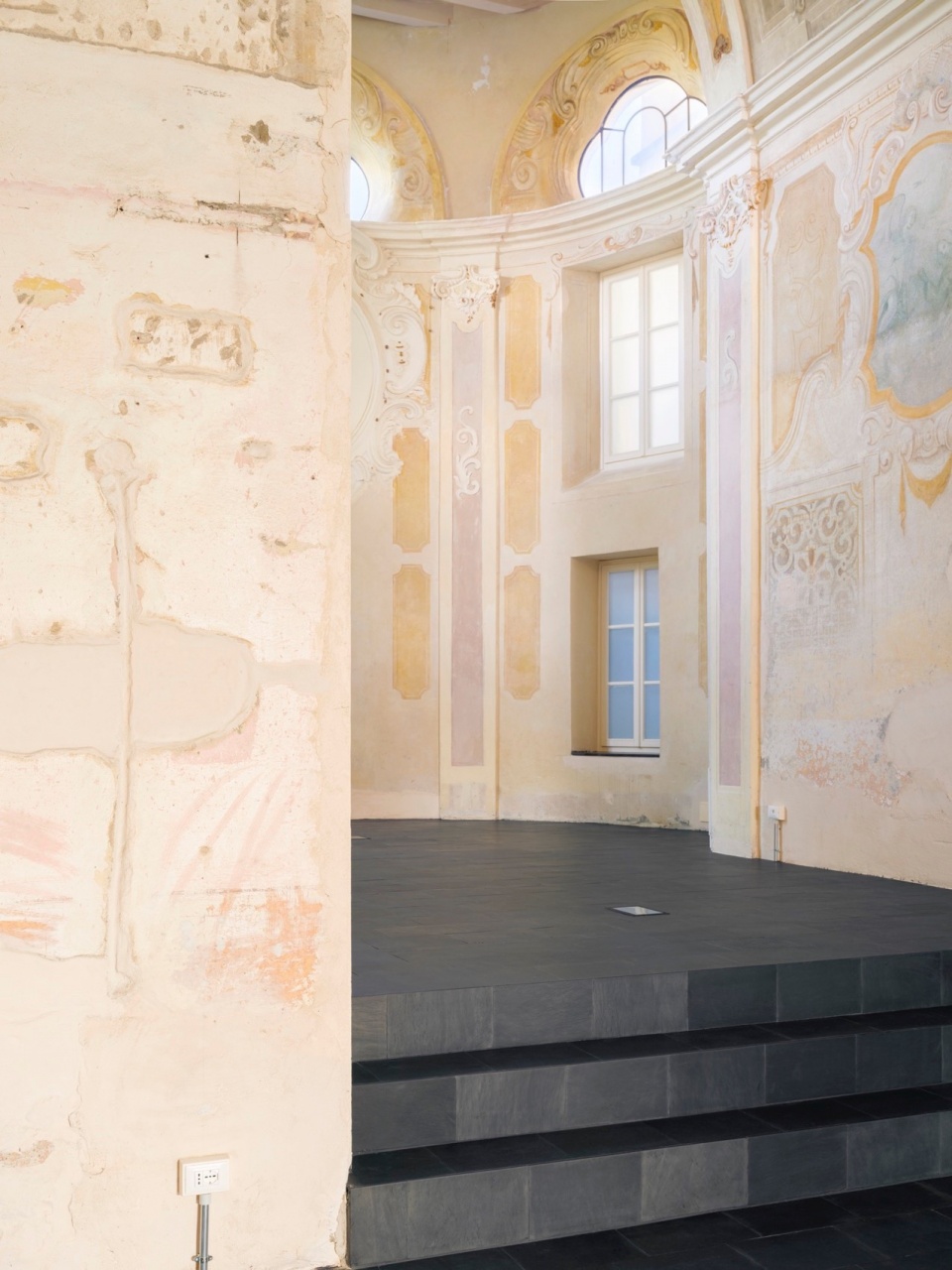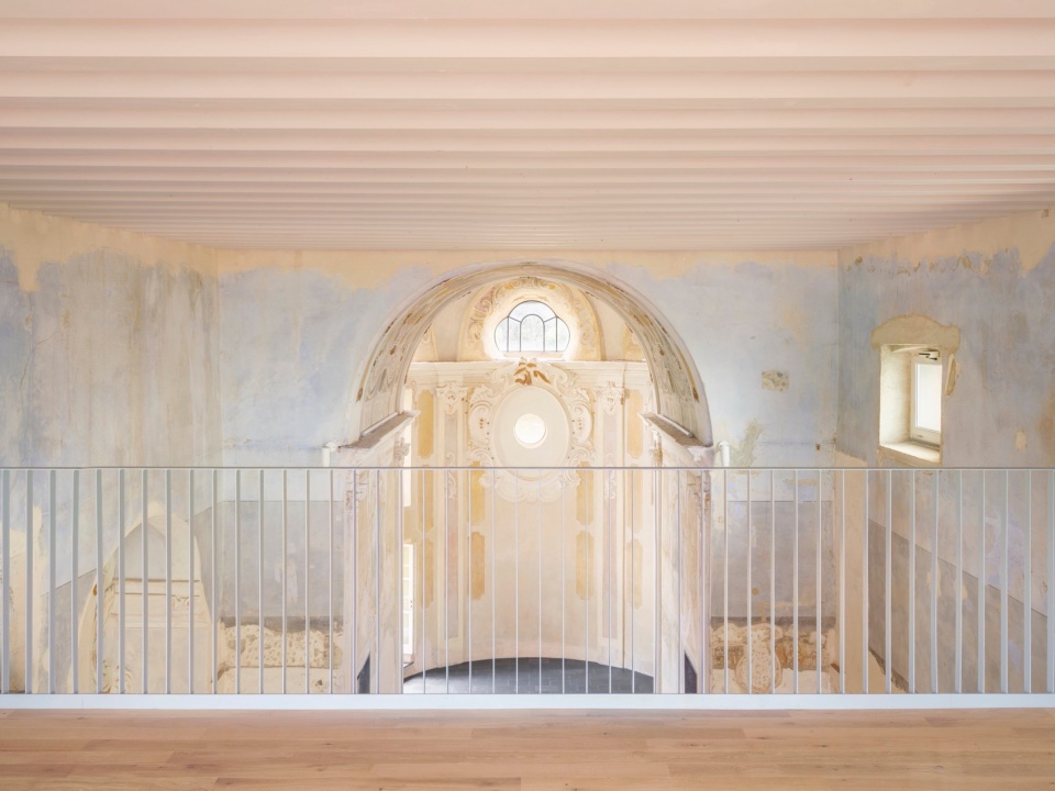 The project is the restoration and renovation of an ancient church transformed into a small conference and event hall. In order to have a reserved and elevated space, a new steel “cantoria” loft was built.