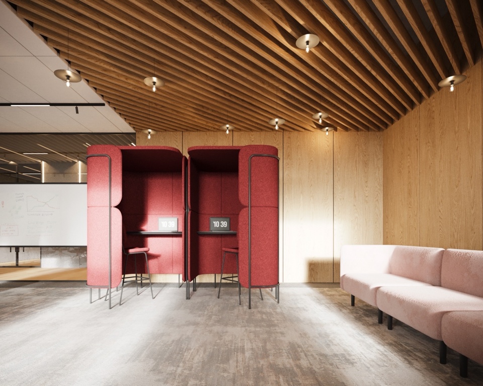 Effective teamwork is supported by informal zones that encourage group communication and brainstorming. Solutions that facilitate fast visualization of ideas boost efficiency and foster creativity. Large tables, whiteboards, and writable surfaces help organize thoughts and support seamless collaboration. Flexibility in workspace arrangement can be achieved through modular furniture, mobile acoustic panels, movable seating modules, and furniture on wheels, allowing spaces to be adapted to users’ current needs.