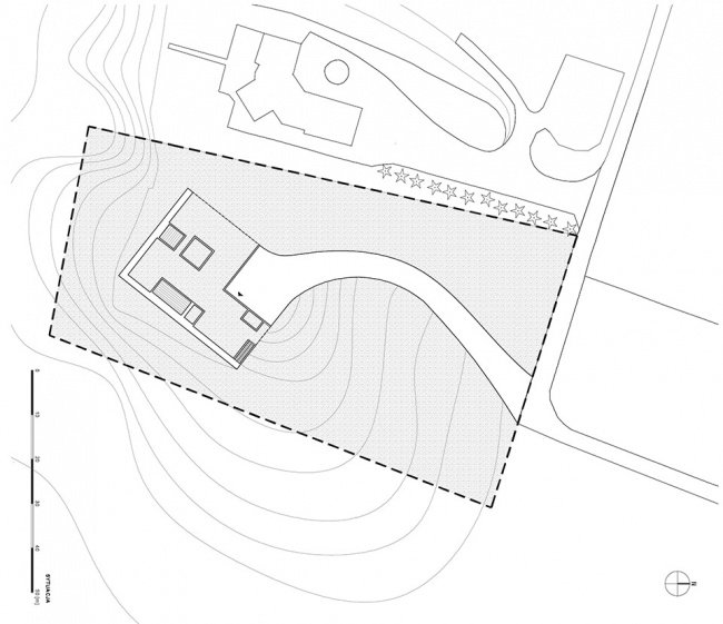 The decision was supported by the surroundings: a large, traditional neighboring house discouraged creating a new form protruding above the terrain, competing with it and introducing disorder on the same promontory.