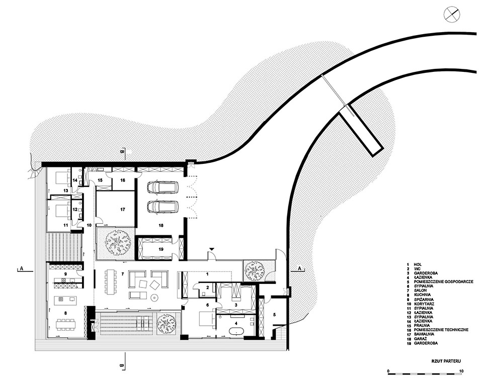 The most interesting landscape frames opened slightly obliquely in relation to the river, which led the designers to rotate the building accordingly. As a result, the house is not positioned parallel to the plot boundaries. This orientation made it possible to capture the view from inside the house of the full profile of the slope with its vegetation and base, completed by the wide ribbon of the Vistula.