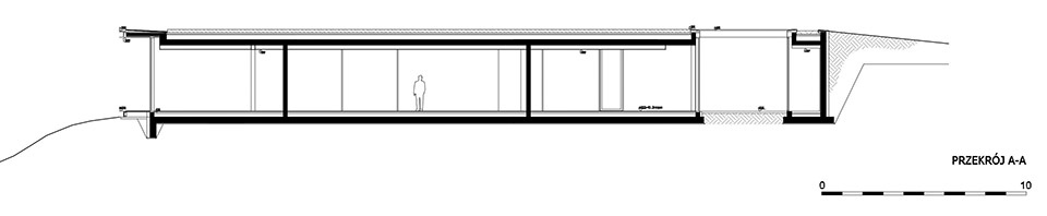 The house was designed to interfere as little as possible with the natural shape of the slope. From the riverside, the escarpment is cut only by a thin cornice line, gently accentuating the horizontal line of the landscape. Further, into the slope, the building penetrates the earth structure and fits into the natural morphology of the site. This solution allows the architecture to hide in the greenery and not obstruct the view of the Vistula panorama for others. To further reduce the perception of the building in the landscape, the entire structure is covered with a green roof.