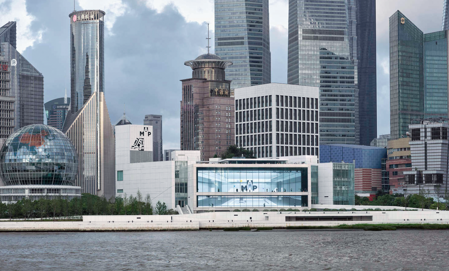 隔江而望,建筑以超大玻璃幕墙面向外滩,最大的玻璃达到3米宽12米高,透过大玻璃,室内侧单向镜面和LED屏幕的叠加,使西立面可作为镜子反射外滩建筑群,或作为巨幅展示屏使美术馆成为一件艺术装置、一个艺术事件。
