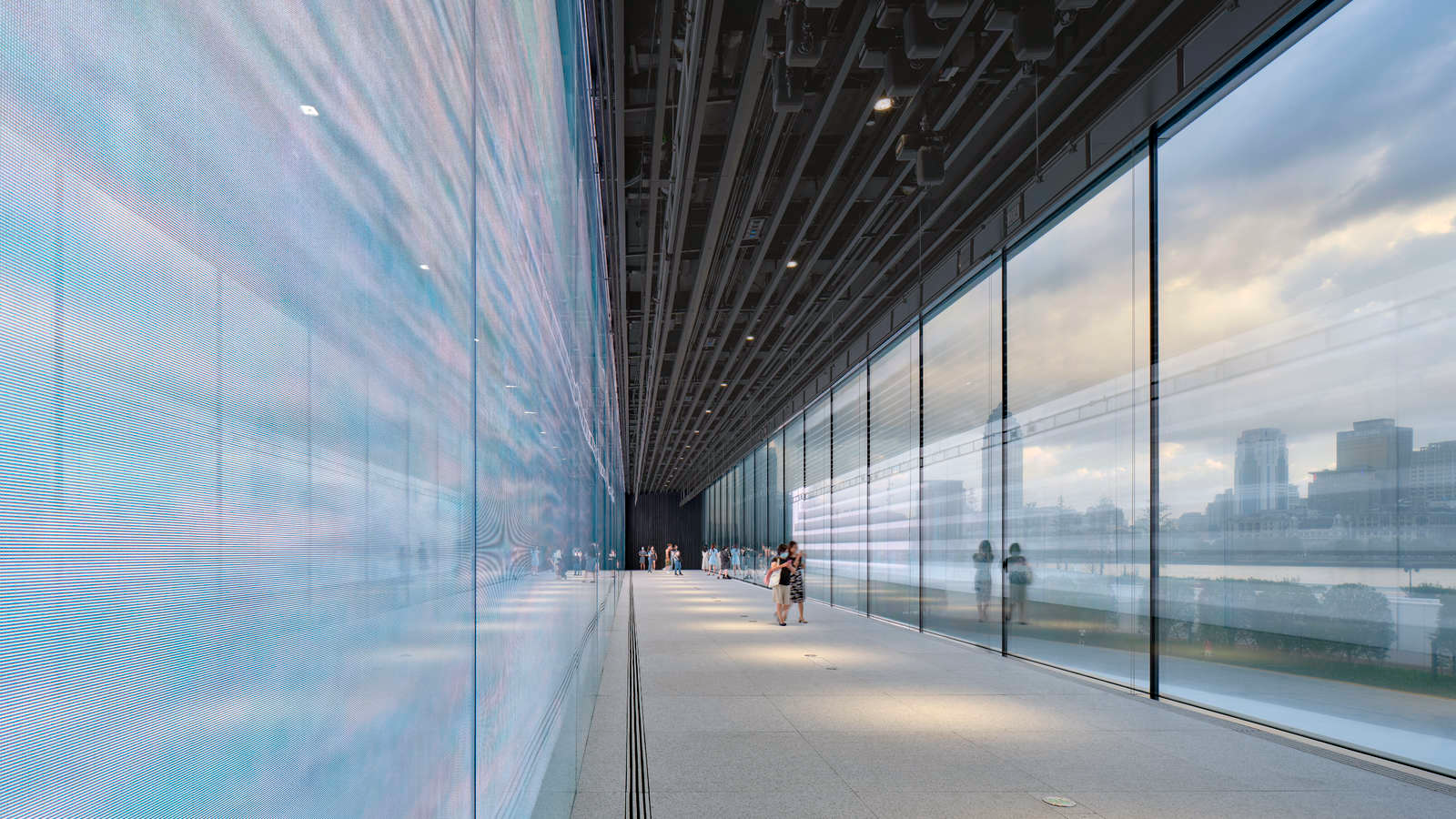 Looking across the river, the building faces the Bund with a super large glass curtain wall. The largest glass is 3 meters wide and 12 meters high. Through the large glass, the superposition of indoor one-way mirror and LED screen makes the West facade reflect the Bund buildings as a mirror, or as a huge display screen, making the art museum an art installation and an art event.