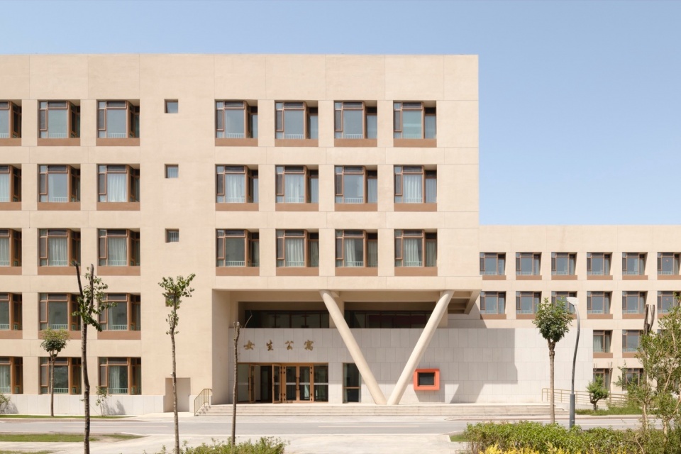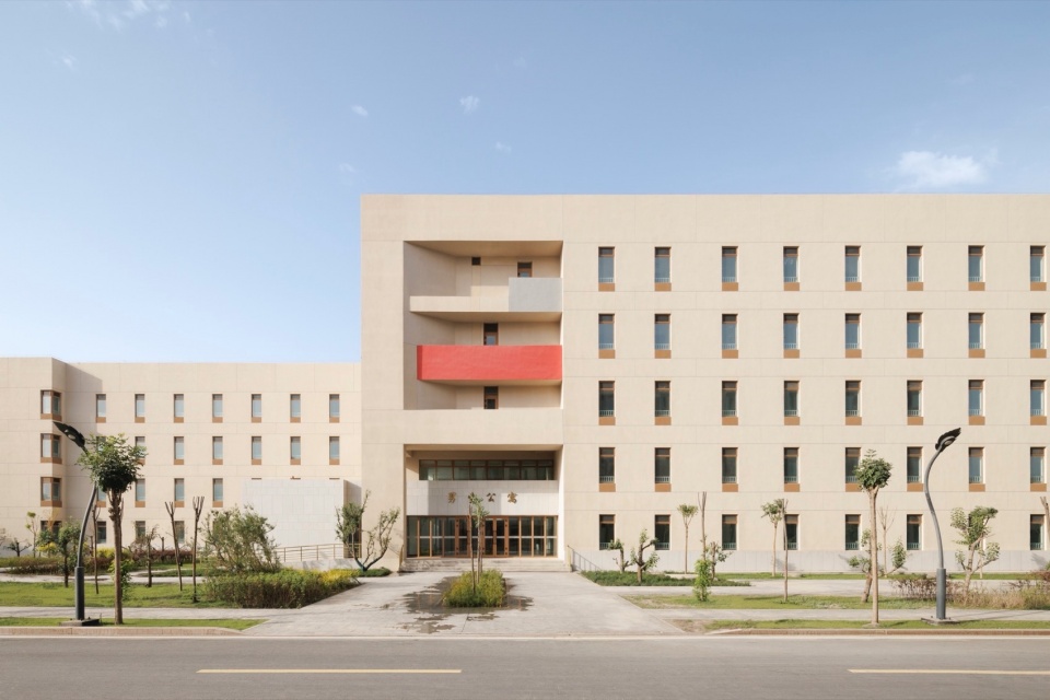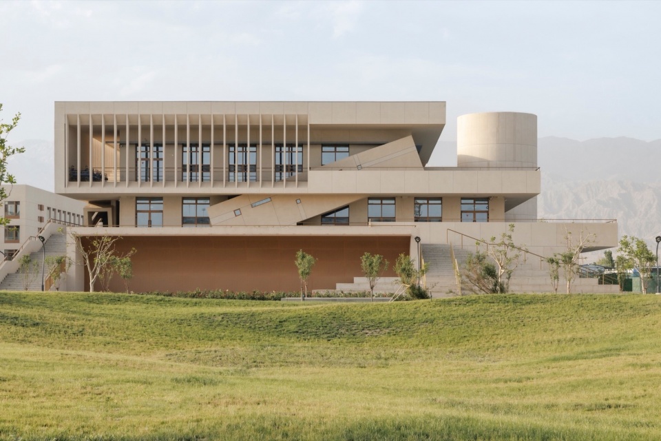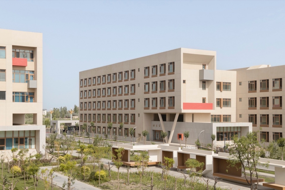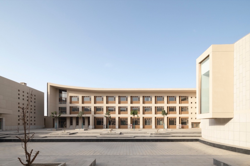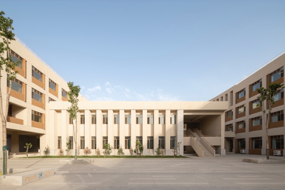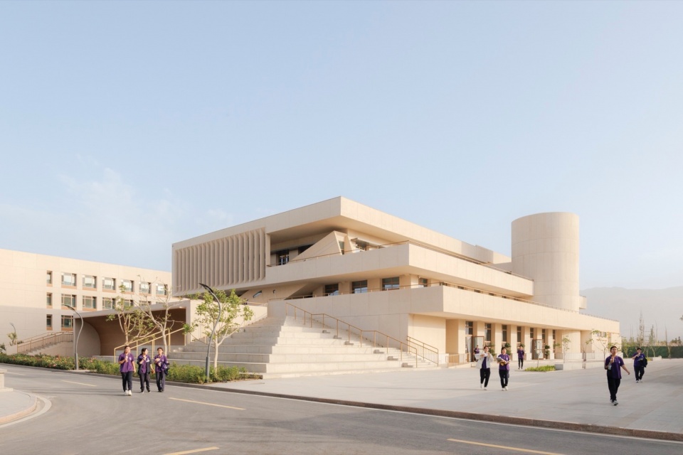 Many aspects of contextual response are dictated by local construction capabilities. After completing several projects in Xinjiang, we observed that local construction teams excelled at handling large-scale structural elements, yet often struggled with precise detailing and finishes. Consequently, the design for Huashan High School consciously embraced this reality: employing the simplest means possible, relying solely on the juxtaposition of solid and void forms and proportional relationships to manifest the building’s power and aesthetic appeal. Within the tension of this bold solid-and-void composition, lies a heroic simplicity echoing the vast desert. Meanwhile, the cement-bonded particle boards cladding sections of the gable end walls introduce a unique texture to this robust framework, adding a distinct layer of character.