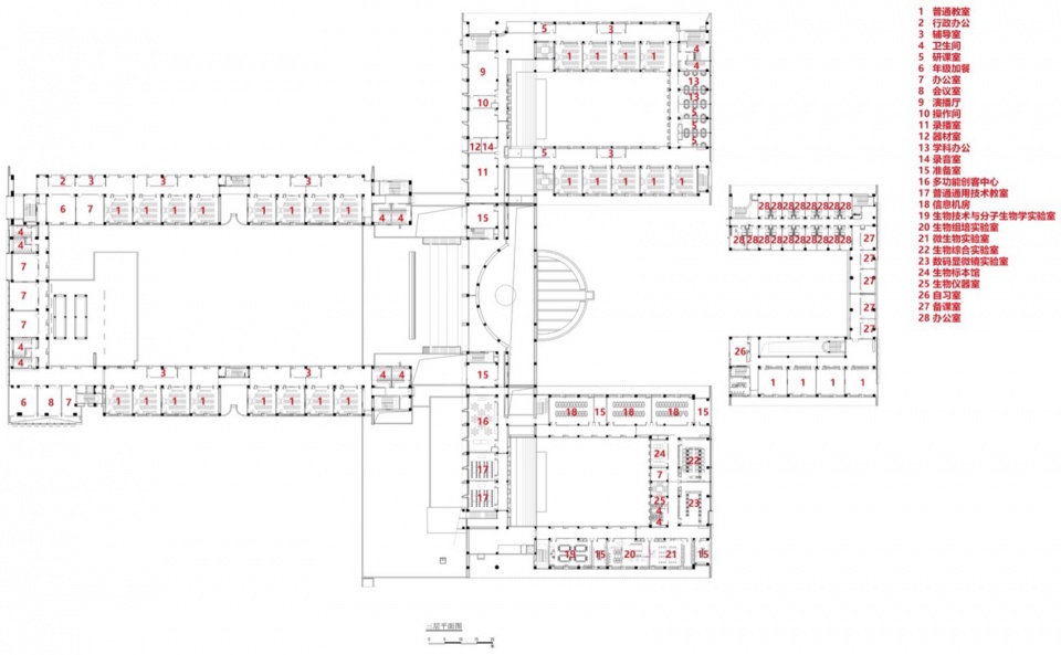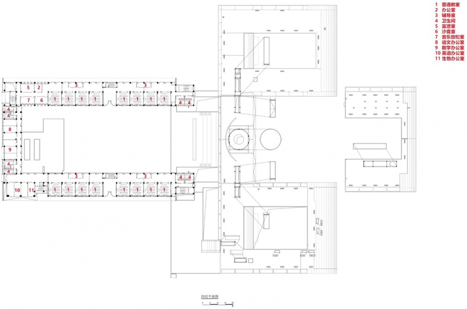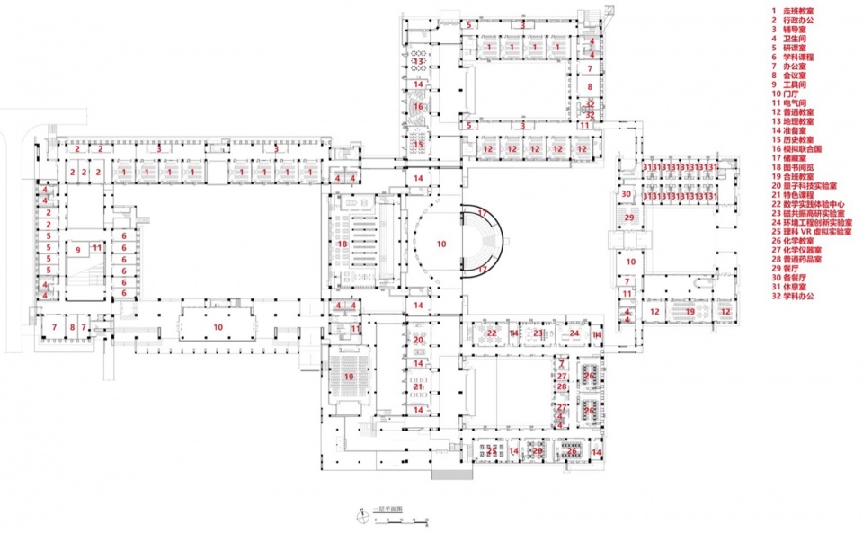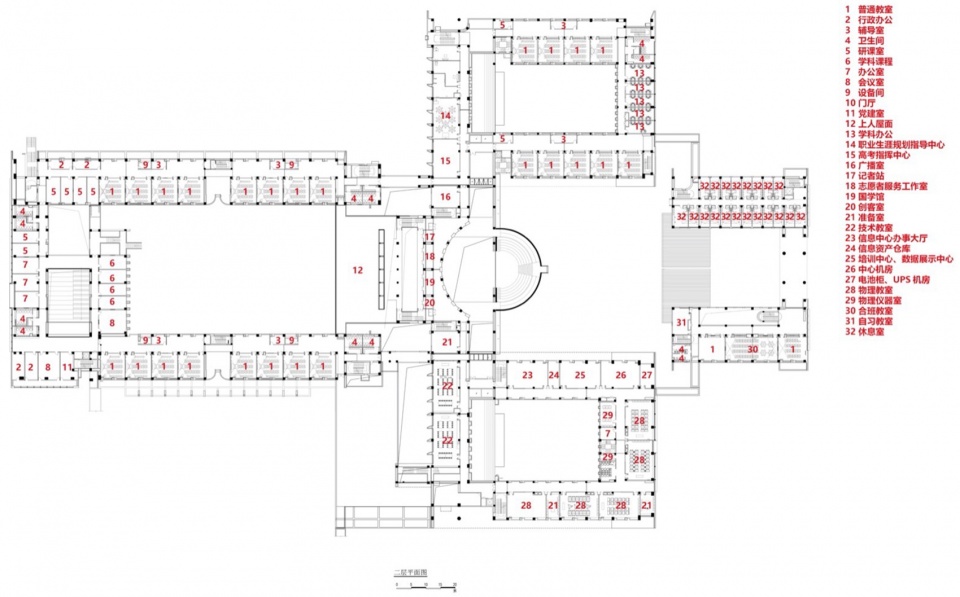 高考的压力迫使高中生 70% 的时间留在行政班内,校园空间因此呈现 “以普通教室为核心” 的热度递减规划格局。与中小学生不同,高中生虽学业繁重,交往模式却已趋近成人,空间也需更具社会属性。“看起来像一所大学”成了设计的核心目标 —— 既要满足高强度学习需求,也要呈现出成年人般的自主与交往空间。