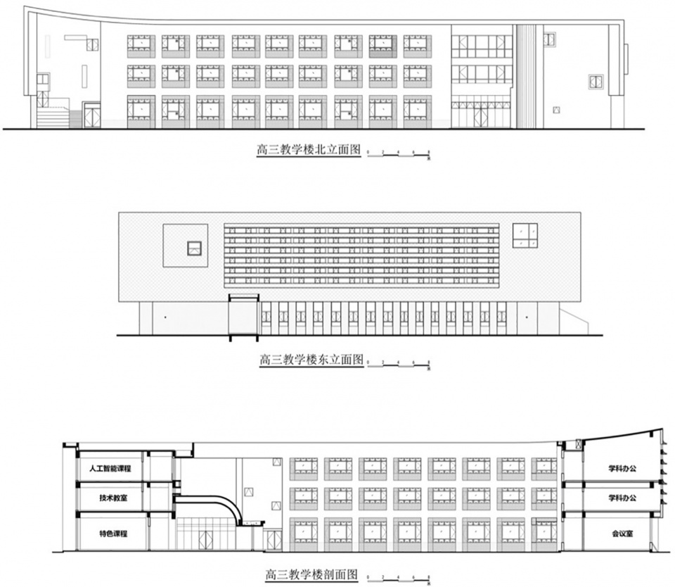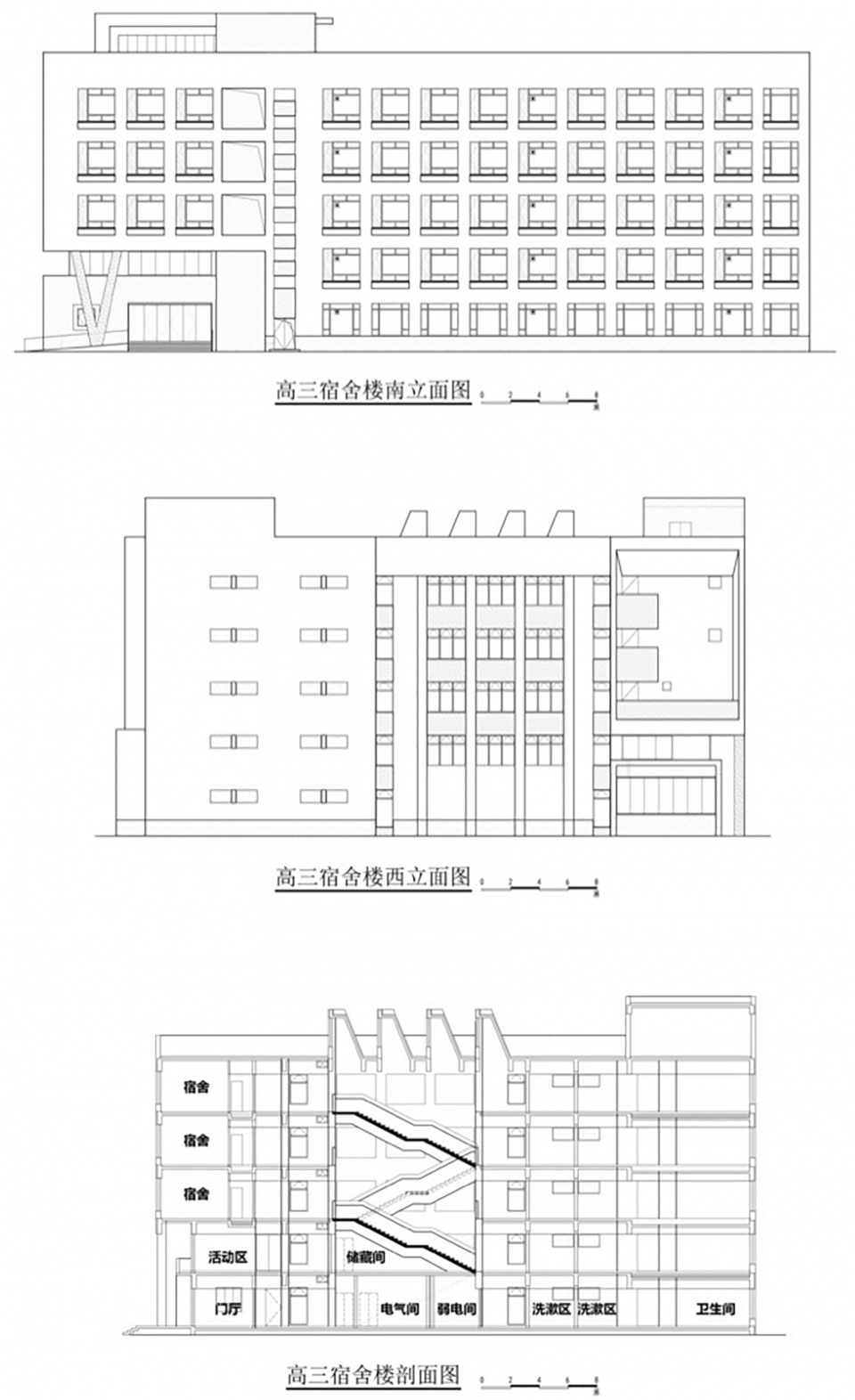 ▼高三教学楼立面图与剖面图,elevations and sections of the teaching building for Grade 12