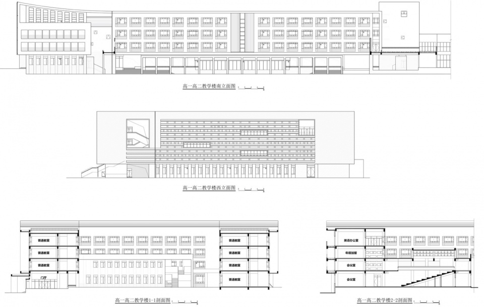 ▼高一高二教学楼立面图与剖面图,elevations and sections of the teaching building for Grade 10&11
