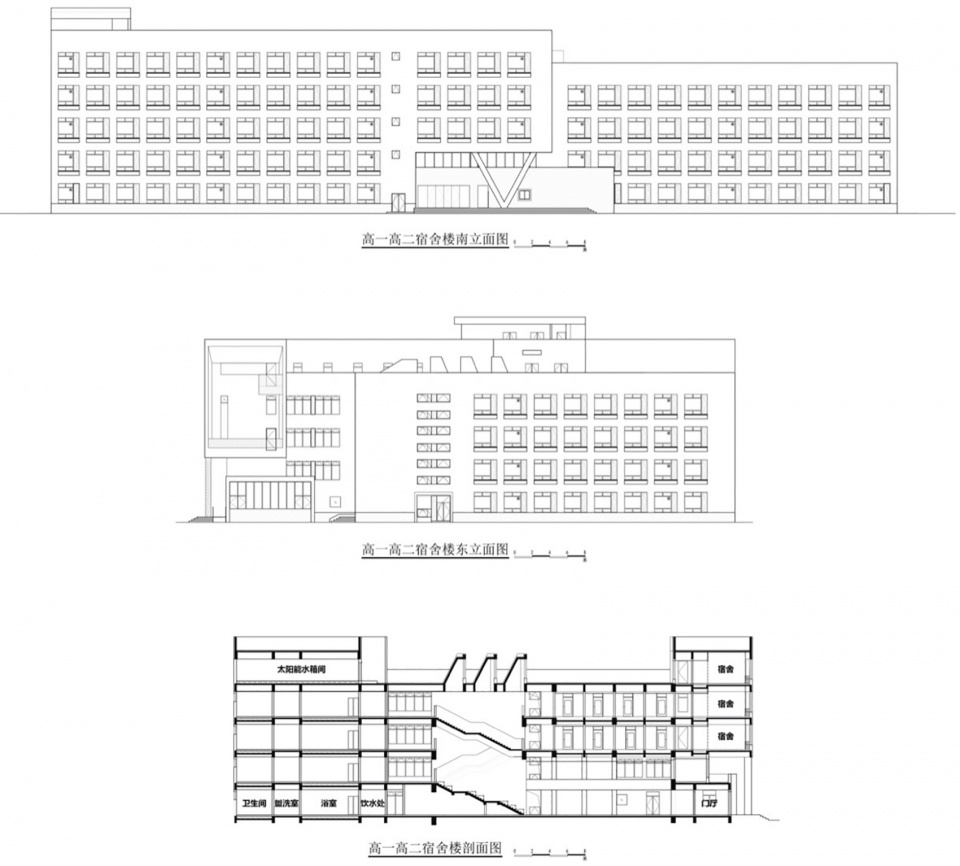 ▼高一高二宿舍立面图与剖面图,elevations and sections of the dormitories for Grade 10&11
