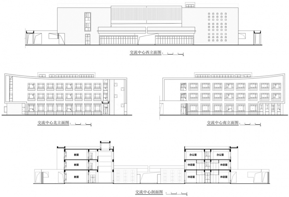 ▼交流中心立面图与剖面图,elevations and sections of the communication center