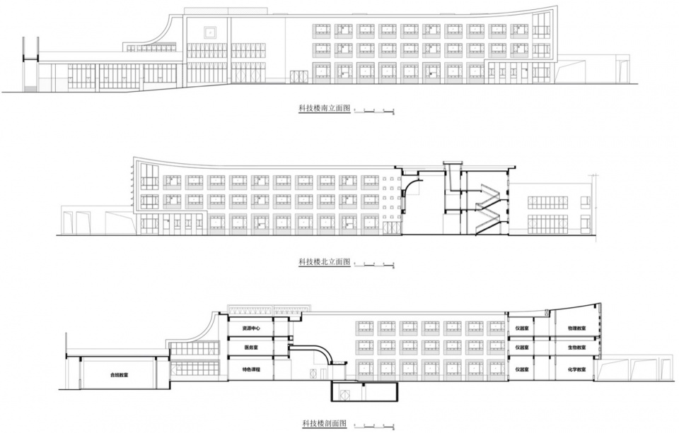 ▼科技楼立面图与剖面图,elevations and sections of the science center