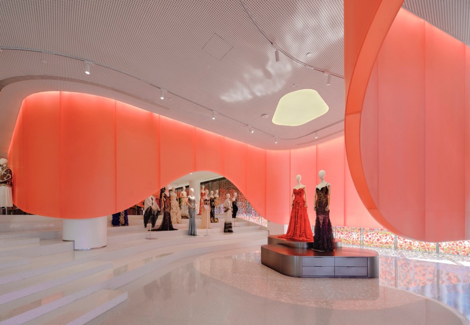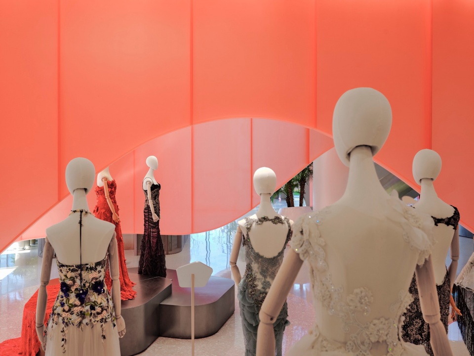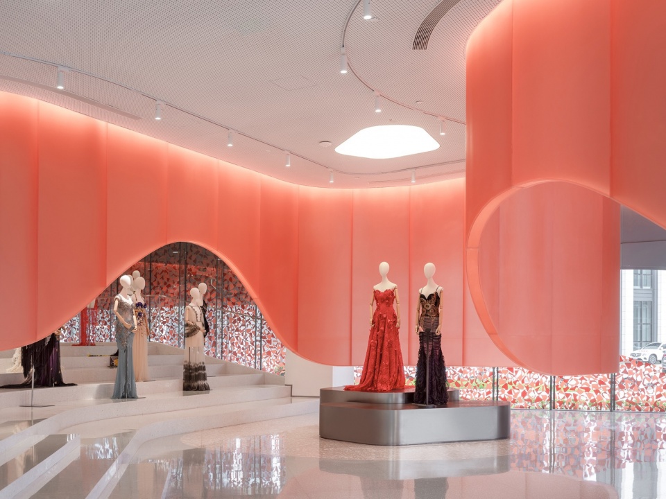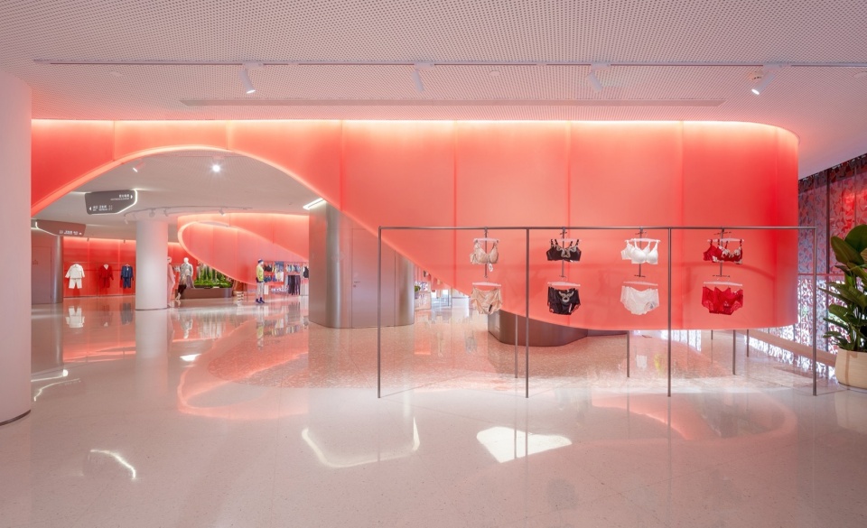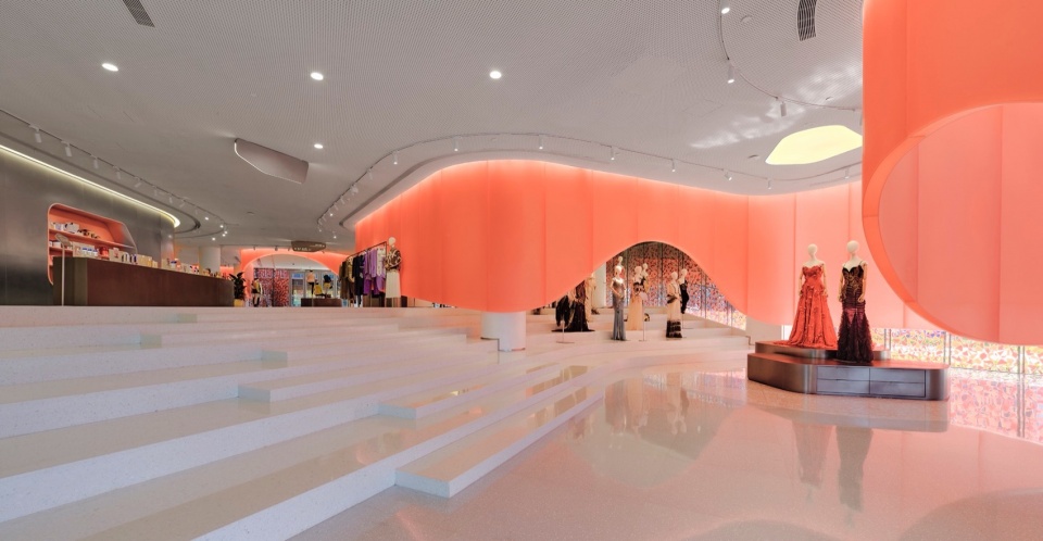 Crossboundaries 负责的室内设计延续了建筑流动连接的概念,使其在空间体验上得以呈现。设计采用曲线元素,并结合嵌入式更衣室、金属表面的展示架,材料选择和色彩搭配确保了统一的视觉识别,进一步强化品牌的核心美学。