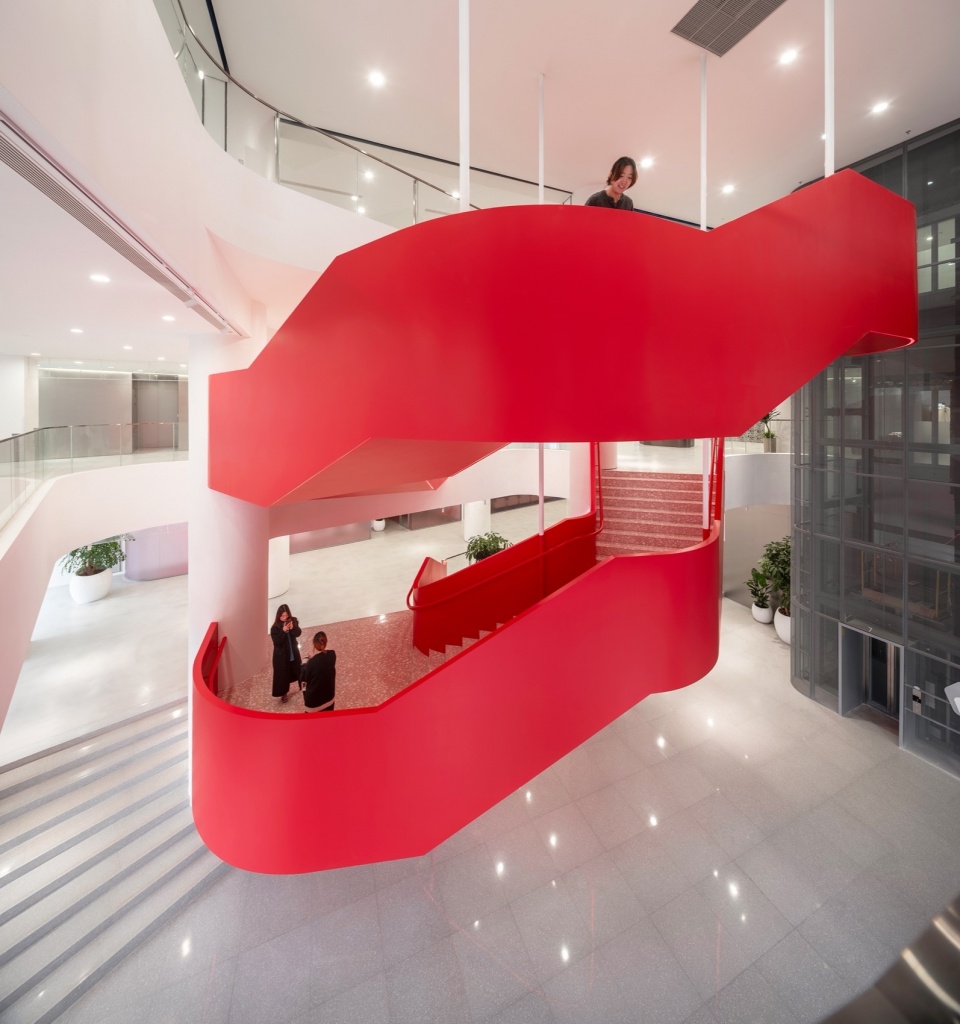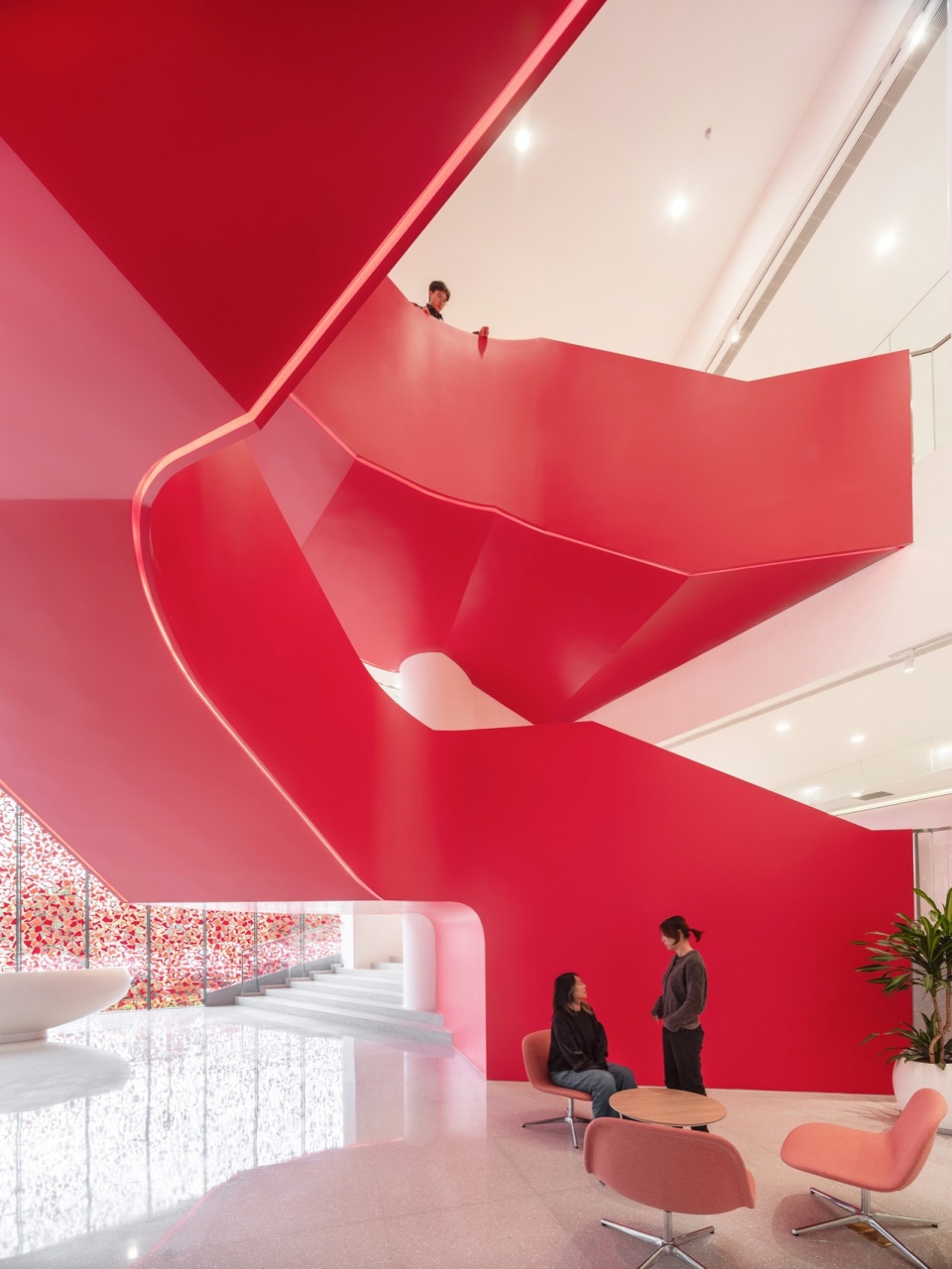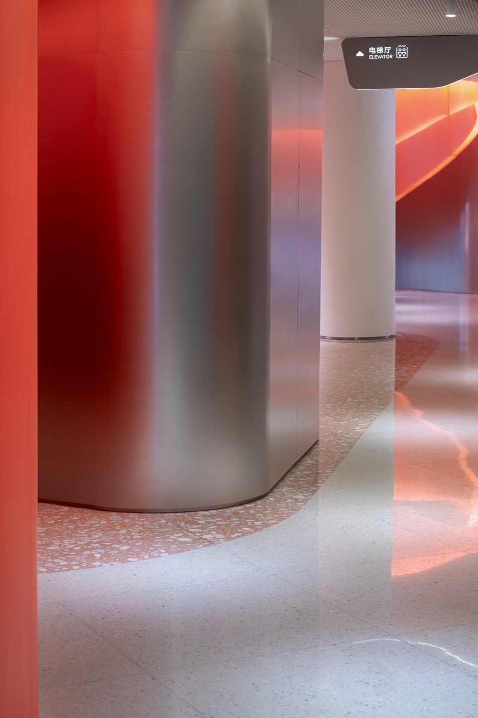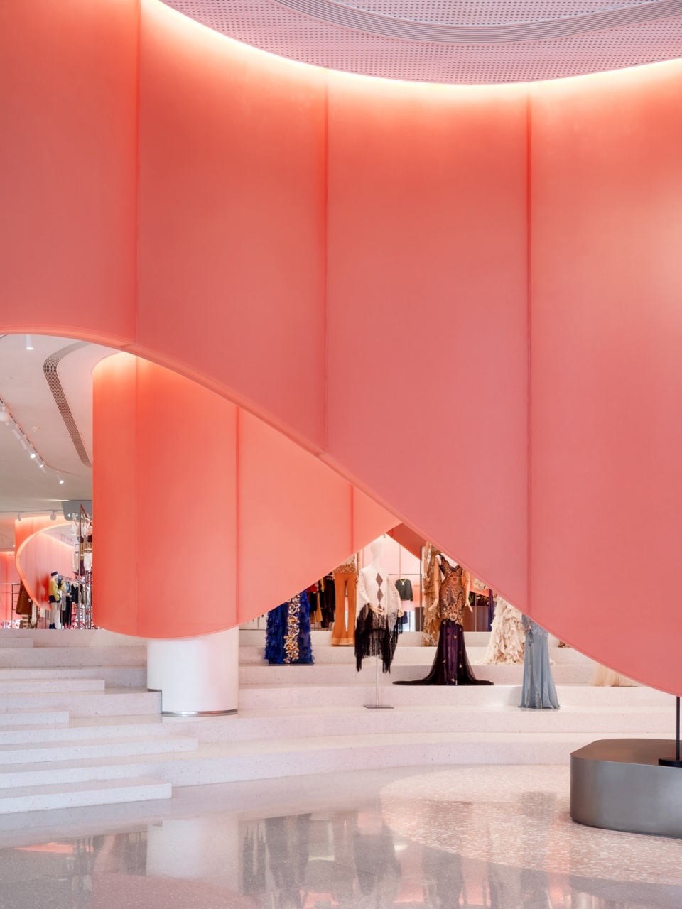 The northwest entrance is marked by a free-shaped crimson colored staircase. Suspended from the ceiling with steel rods, the sculptural piece gives the illusion of a free-standing spiral, elevating the overall geometry of the space. The bold form enhances the arrival experience spanning three floors, serving as both a functional connector and a visual centerpiece, reinforcing the dynamism of the lobby. The staircase, normally utilized as the means of vertical circulation, also serves as a platform for brand events and as a fashion stage. Throughout the building, the motif of fluidity continues. Transitions between levels, achieved through layered landscapes, intermediate platforms, and open staircases, solidify the continuity in the spatial sense, echoing throughout the entirety of the user experience.