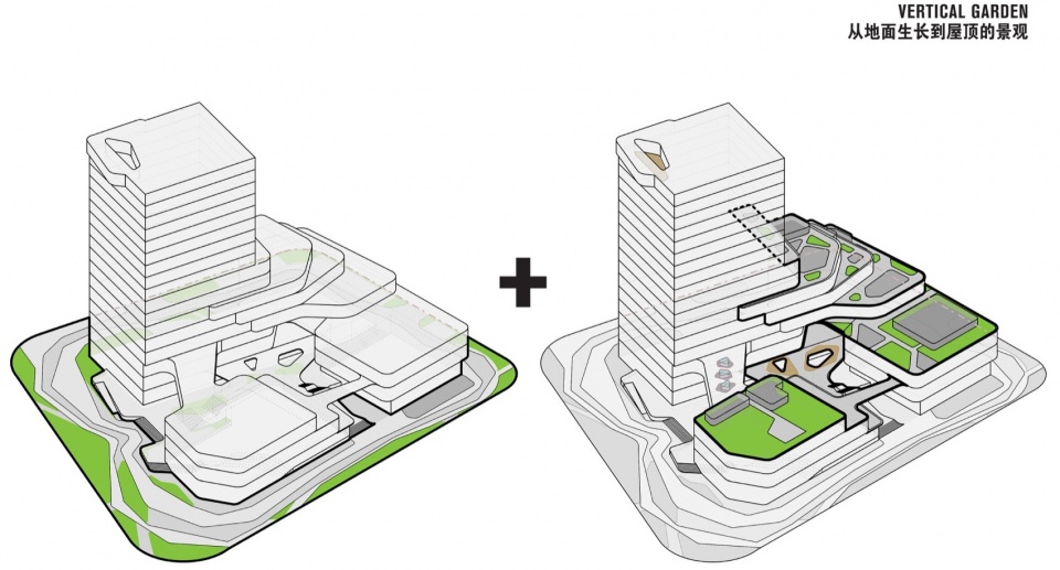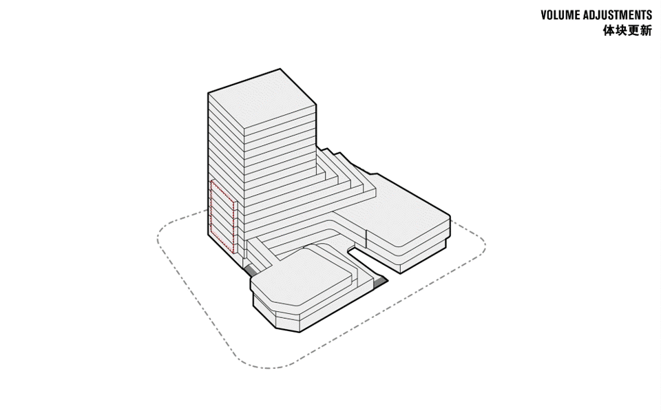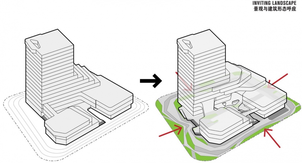 原本分散且单一的空间布局被重新整合为一个高度互联的多功能空间,提高了整体的连通性和多样性。改造后的建筑群由三个相互连接的体量组成,并由一座 17 层高的塔楼作为核心。塔楼的低层部分向外延展,并逐步形成多个露台,使建筑与周围环境形成视觉上的延续和融合。建筑之间规划了可步行的有机景观空间,形成两个重叠的平台,不仅起到过渡作用,也增强了空间的整体连贯性。南侧和西侧设有大型户外阶梯,引导访客进入建筑群,同时这些有机形态的开口与整体设计中的图案相呼应,保持了统一的视觉语言。
