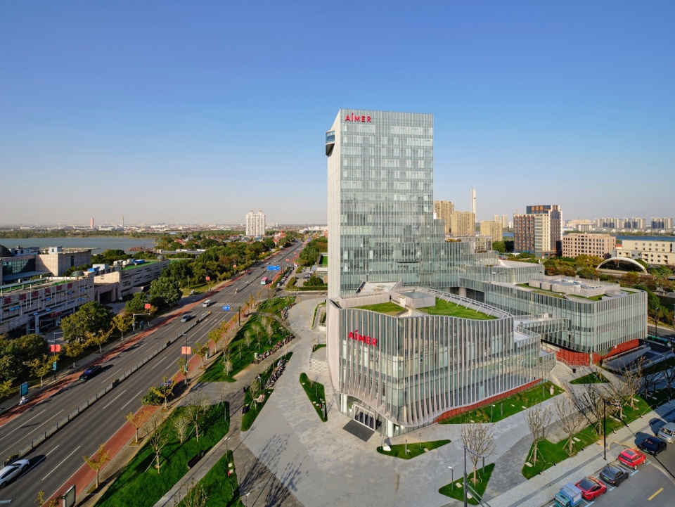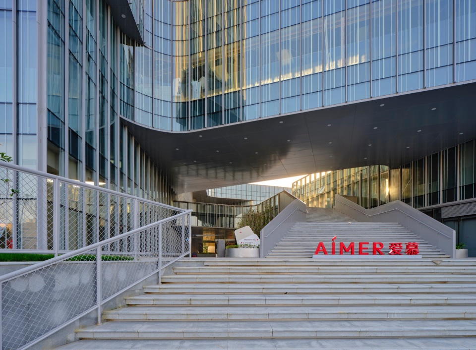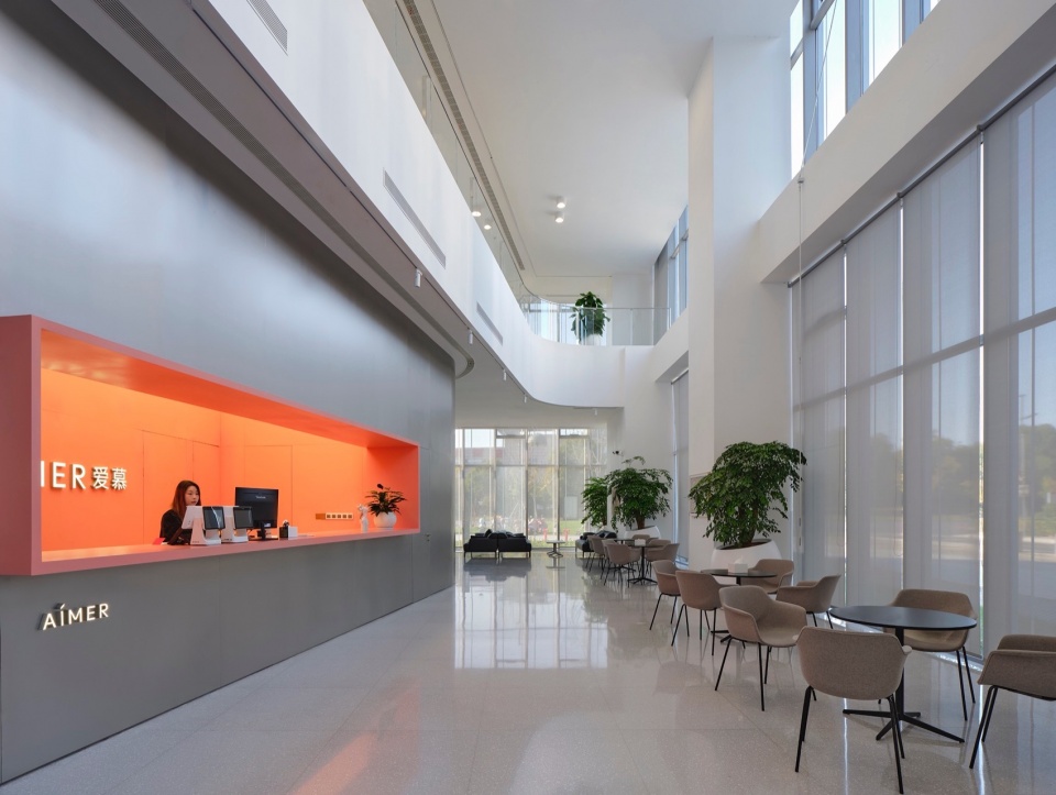 Located in Suzhou’s Fenhu district, where land and water intersect, the building benefits from its strategic position, as a transportation hub between Suzhou and Shanghai. When Crossboundaries took on the project in 2019, construction had already begun with the basement completed. The redesign aligned the space with Aimer’s evolving brand vision and functional needs, integrating architecture, identity, and user interaction.