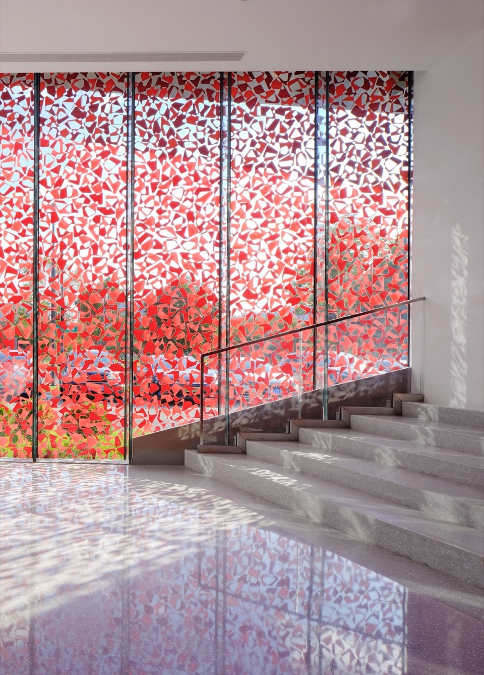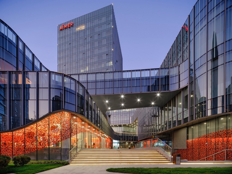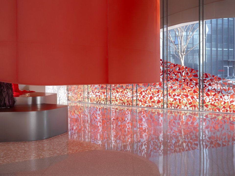 建筑基座部分,在玻璃幕墙下方还能看到一层红色的肌理图案,宛如蕾丝或织物,将立面设计与Aimer的品牌形象直接联系起来。这种层叠效果在西南入口尤为突出,玻璃似乎轻轻悬浮于地面之上,隐约展现出下方精致的图案。这一图案由两种不同色调的红色不规则几何形组成。形态大小各异,有些相互重叠或交错,在交汇处形成透明效果,模拟出蕾丝般的层次感。整体设计呈现出复杂的红色构图,与周围环境形成独特的互动。