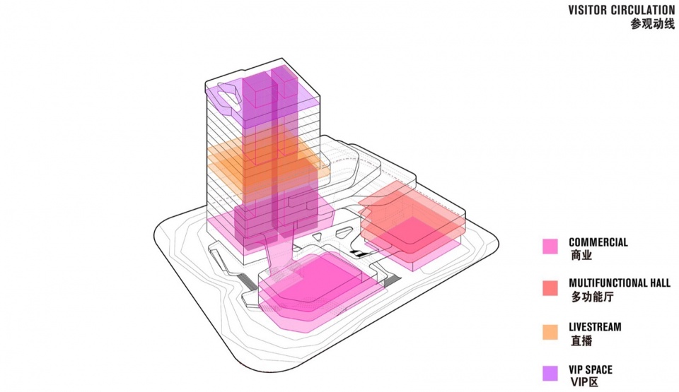 爱慕第二总部体现了一种向体验驱动型建筑的转变,不同功能在空间中交融,为商业、酒店和品牌叙事创造出富有活力的动态流线。建筑不局限于单一功能,而是基于适应性和互动性进行设计。这一理念正是Crossboundaries设计方法的体现——打造促进人与空间、产品与场所之间更紧密联系的建筑。