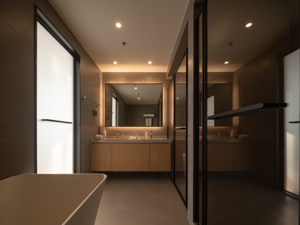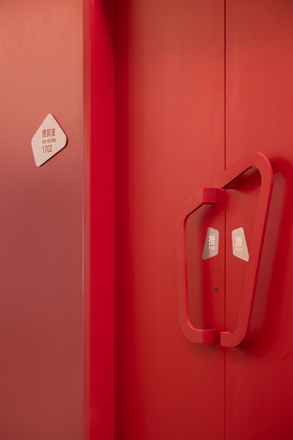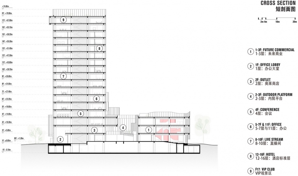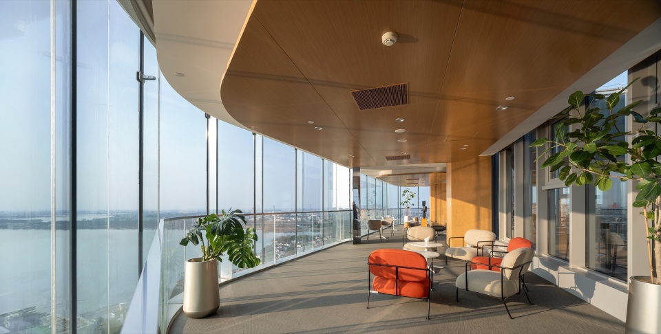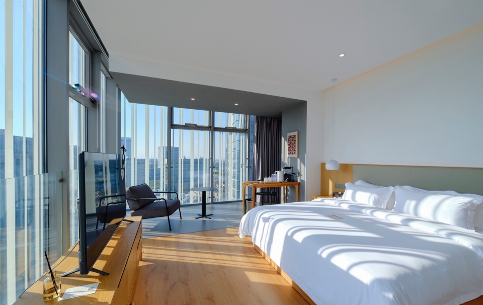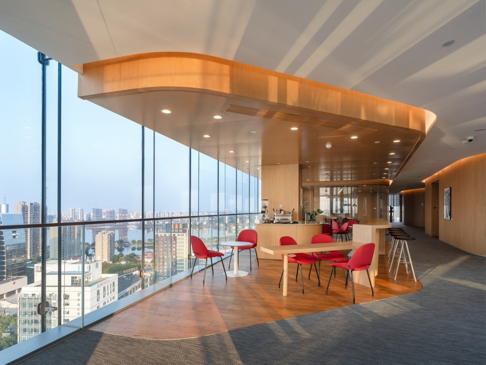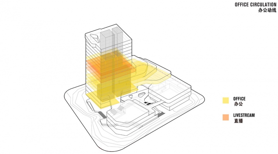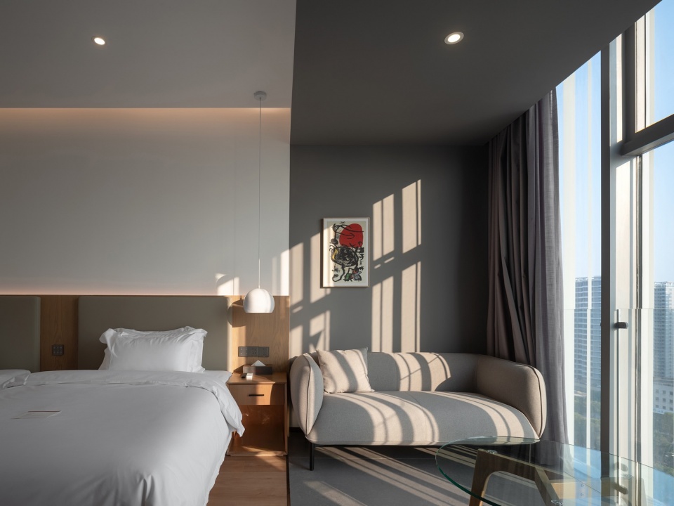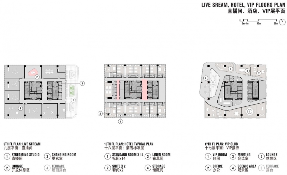 八至十层的直播空间成为连接实体与数字商业的关键场所。室内采用不锈钢材质和红色霓虹灯光,塑造高科技氛围,满足实时内容制作的需求。九层设有公共观摩区,访客可通过大面积玻璃窗直观感受直播运营的过程,进一步理解品牌的线上销售策略。十一至十六层则作为酒店区域,以温暖自然的材料和开阔的湖景营造静谧的休憩环境。木饰面、白色墙面及灰色编织地面相结合,并配以精心挑选的艺术品,使酒店内饰在视觉上形成与下层公共区域的柔和对比。塔楼的 17 层为行政楼层,设有向外延展的全景玻璃窗,提供无障碍的湖景及周边景观视野。