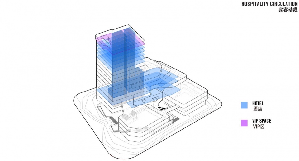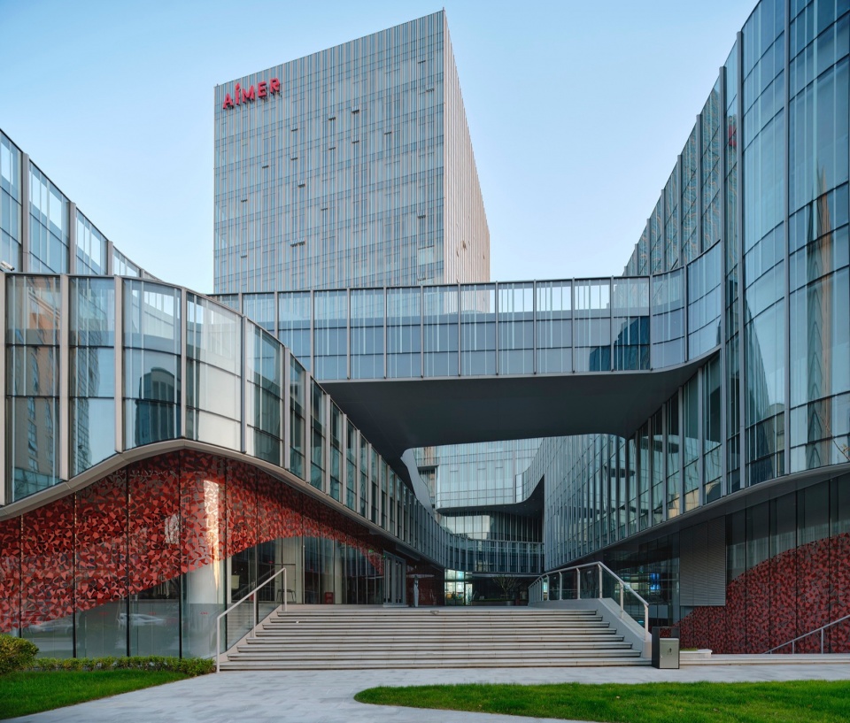 The Aimer 2nd Headquarters integrates a diverse range of functions. The combination of Commercial areas, outlet, offices, live streaming, hotel, conference functions, multifunctional hall, and VIP reception, complete a building that caters to business travelers, shoppers, and creative professionals alike. Beginning on the ground level, from the southwest into Aimer’s showroom and retail spaces, the immersive architecture enhances personalized shopping experiences. Exhibition and cultural spaces are made accessible from the northeast entrance via a grand signature staircase, expanding the building’s public engagement with arts and events. As we move upwards, the third floor provides a space dedicated to Aimer’s spa retreat, providing a wellness-focused environment. Above, office spaces on floors 4–7, with emphasis on transparency and flexibility, features open layouts, curved glass partitions, and wooden finishes, with red seating niches that subtly reinforcing Aimer’s brand identity.