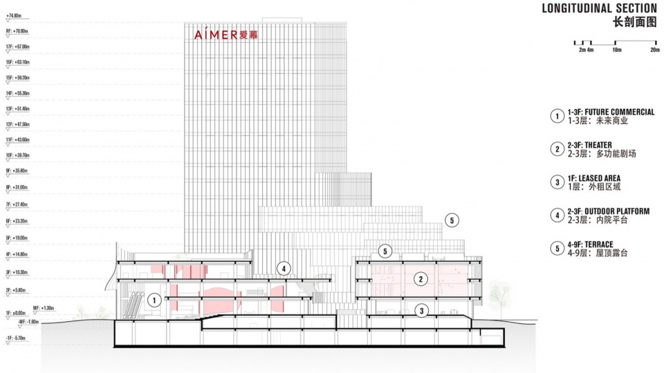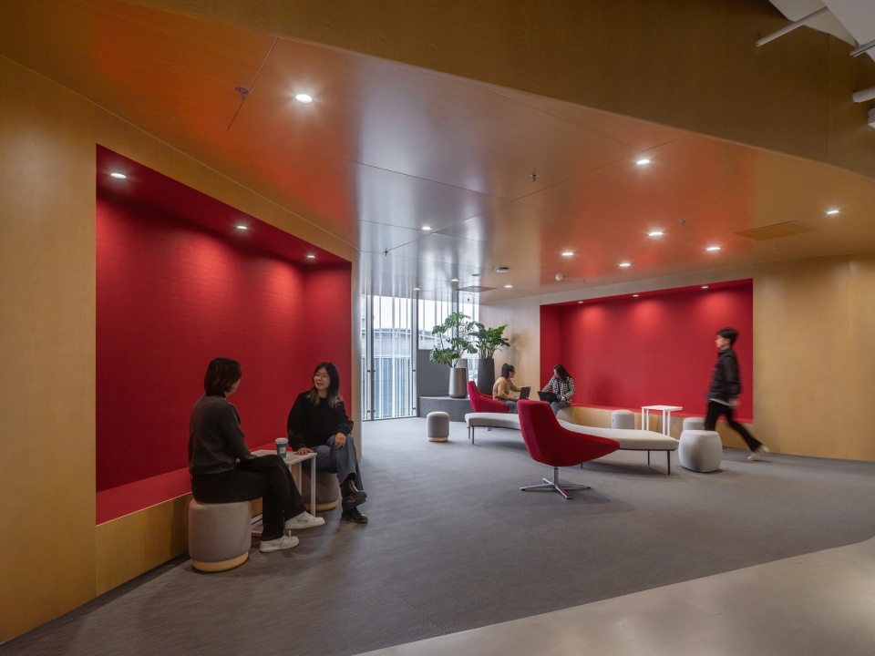爱慕苏州第二总部集商业、零售、办公、直播、酒店、会议、多功能厅及 VIP 接待等多种功能于一体,为商务人士、购物者和创意从业者提供多层次的体验。一层西南入口连接爱慕品牌展厅与零售空间,沉浸式的建筑设计强化了个性化购物体验。东北侧入口的大型标志性阶梯通往展览及文化空间,拓展了建筑与艺术及公共活动的互动性。三层设有爱慕品牌专属的水疗中心,打造健康与放松的环境。四至七层的办公区域以开放布局、曲面玻璃隔断及木质饰面为特色,并结合品牌标志性的红色座椅空间,营造出透明灵活的工作氛围。