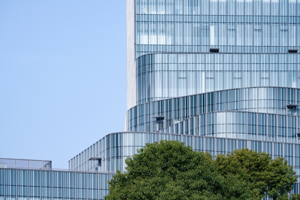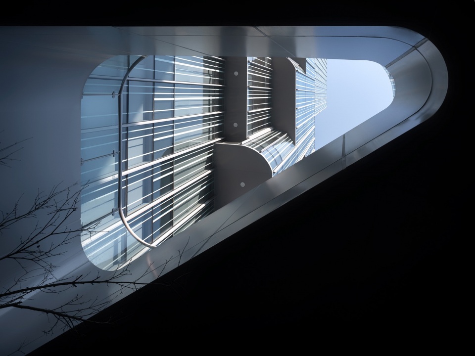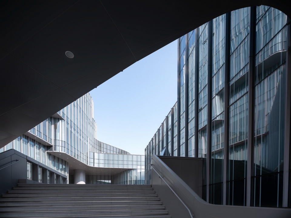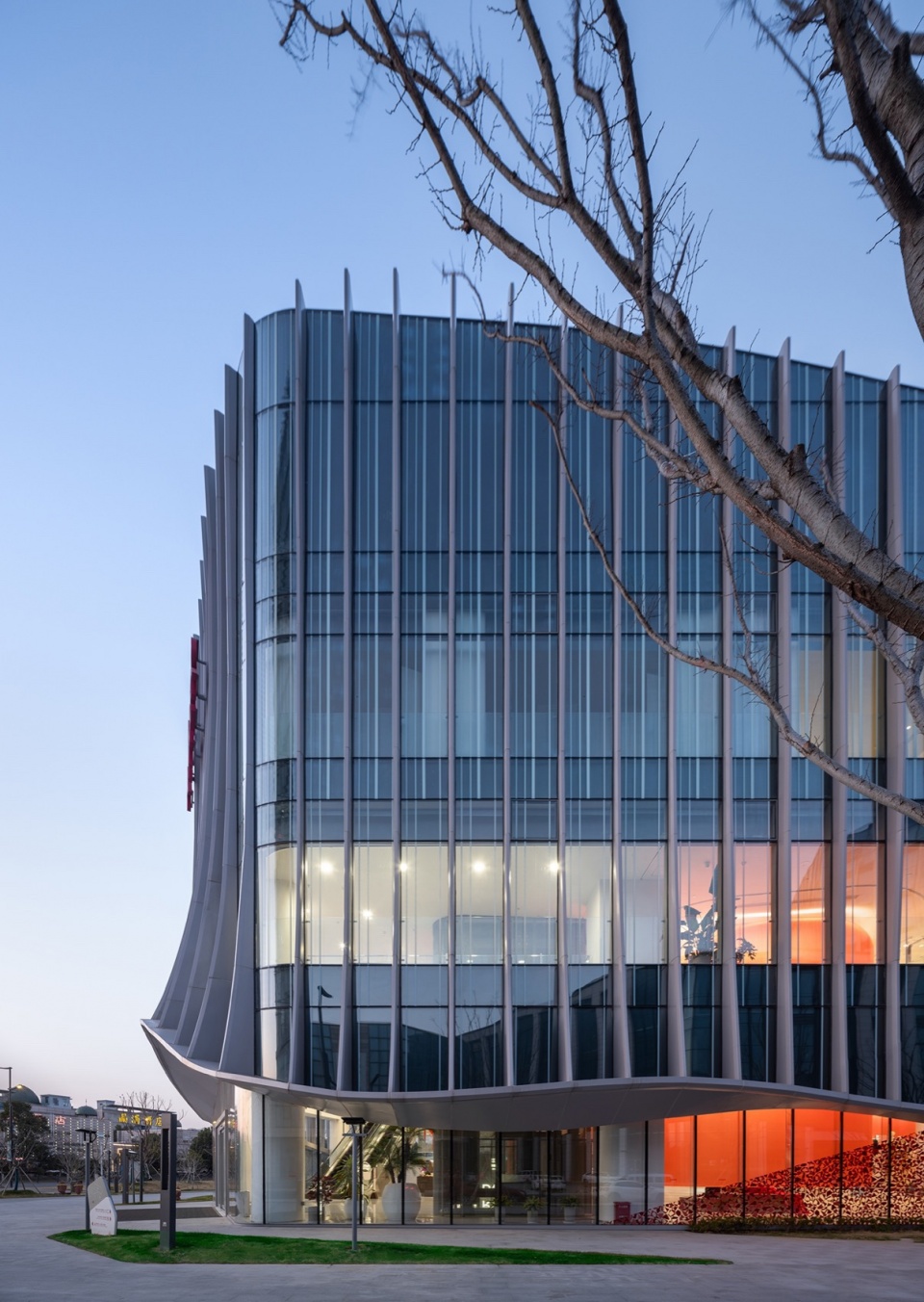 建筑立面采用幕墙系统,由垂直金属格栅与白色竖向线条构成。随着楼层的升高,立面图案的密度逐渐增加,使整栋建筑在视觉上更具层次感,同时微妙地映射出室内功能的变化。裙楼部分的立面展现出更具动感的表达方式。曲线转角与内凹区域塑造出波浪般的动态效果,强化了建筑底部更自由活跃的空间体验。塔楼上层的金属格栅延展至这些曲线之上,使建筑外观保持流动的整体性,同时加强了结构的统一性。