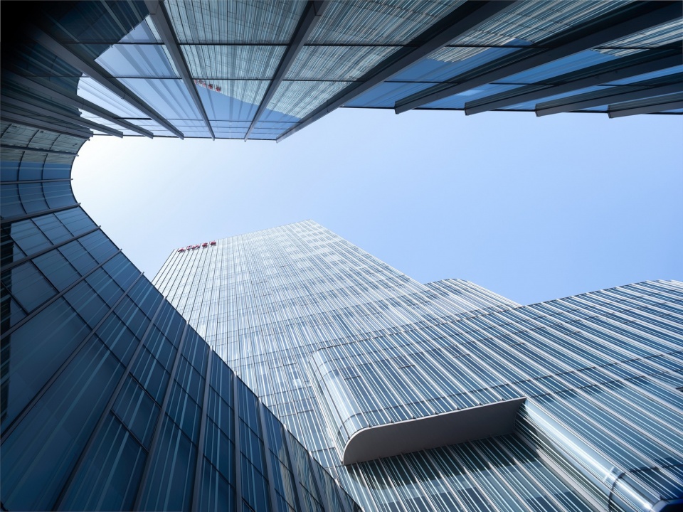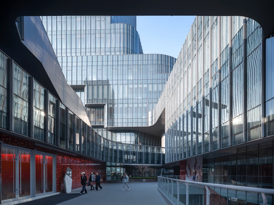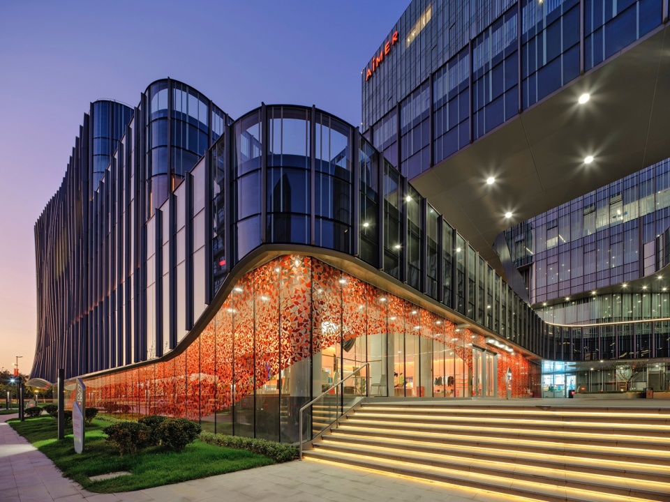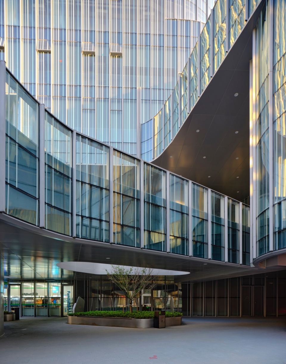 建筑立面采用幕墙系统,由垂直金属格栅与白色竖向线条构成。随着楼层的升高,立面图案的密度逐渐增加,使整栋建筑在视觉上更具层次感,同时微妙地映射出室内功能的变化。裙楼部分的立面展现出更具动感的表达方式。曲线转角与内凹区域塑造出波浪般的动态效果,强化了建筑底部更自由活跃的空间体验。塔楼上层的金属格栅延展至这些曲线之上,使建筑外观保持流动的整体性,同时加强了结构的统一性。