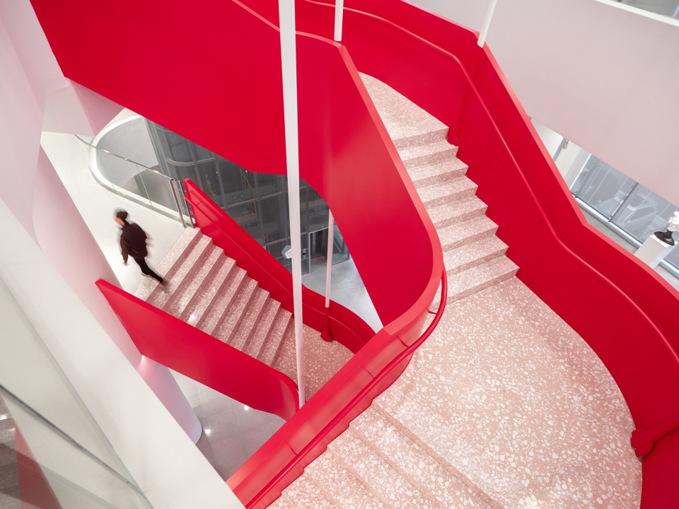 西北入口处设有一座自由造型的深红色楼梯。该雕塑般的结构通过钢杆悬吊于天花板,呈现出自立式螺旋的视觉效果,增强了整体空间的几何感。大胆的造型横跨三层楼,不仅作为功能性的垂直交通节点,也成为大堂内的视觉焦点,赋予空间更多动感。同时,这座楼梯不仅承担了通行功能,也能作为品牌活动和时尚展示的舞台。建筑整体延续了“流动性”这一设计主题。不同楼层之间的过渡通过层叠景观、中间平台和开放式楼梯来实现,强化了空间的连续性,使用户在整个建筑中的体验更加流畅。