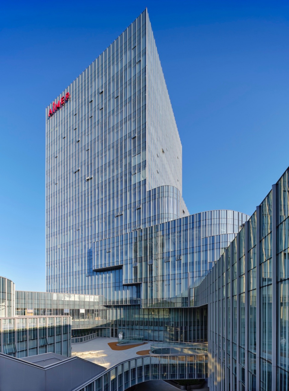 The façade incorporates a curtain wall system with a combination of vertical fins and white vertical lines. The pattern transition through the change in height, becoming denser as the floor levels get higher, adding intensity to the 17-story tall façade as well as subtly reflecting on the shift in the interior program. At the podium level, the façade transforms into a more dynamic expression. Curved corners and recessed sections create a wave-like motion, enticing the more active and free flowing aspect in which the lower levels of the campus can be experienced in. The metal fins of the upper floors extend over these curvatures, contributing to the building’s fluid aesthetic while also enwrapping the transition as part of a holistic design.