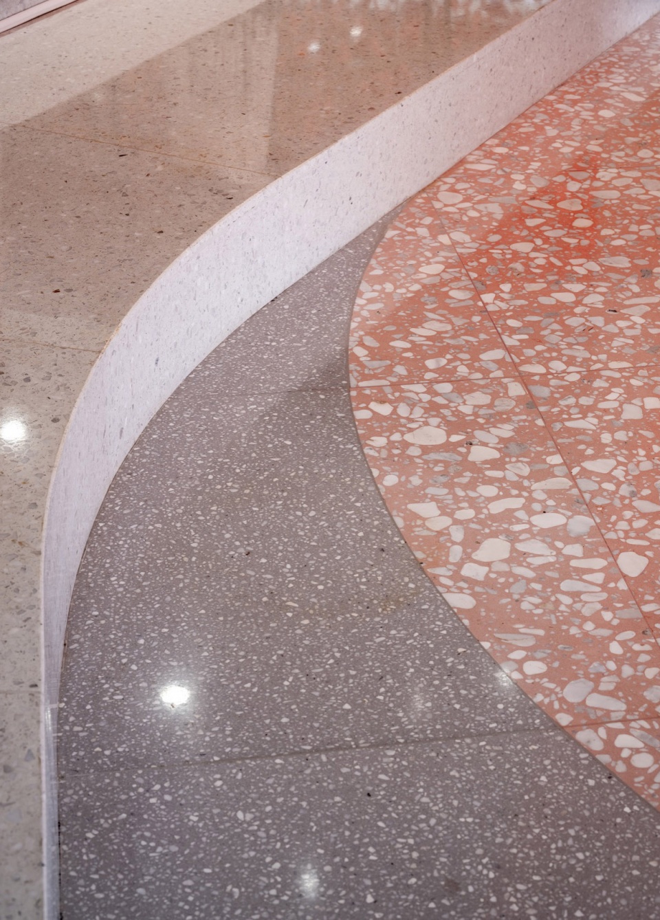 展厅内的核心设计元素是一条曲线形态的空间丝带。该结构采用浅珊瑚色的纹理聚碳酸酯材质,从地面穿透并延伸至两层空间,创造出视觉上的连续性。地面铺设玫瑰色水磨石,其中混合了浅色颗粒,形成温暖、自然的肌理效果。抛光表面增强了光线的反射,使自然光和人工照明在空间中交融,与红色丝带结构的色调相互呼应。宽敞且有角度的台阶引导访客流畅地穿梭于各个区域,优化了空间的动线,增强了整体的流动感。不同元素的相互作用构建了一种强调开放性和连续性的设计语言。