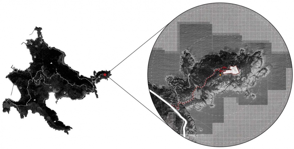 由于大部分建筑已多年无人使用,植物覆盖了道路和礁石,调研人员已经无法进入村落。显然,村落的原始道路、水电等基础条件并不能满足现代酒店项目的施工、开发和运营条件。设计团队深知历史记录保护与商业诉求之间深层的矛盾,为了避免黄龙岛陷入“风貌同质化、体验浅表化”的困境,设计最初的核心工作是让肌理延续再生,其核心在于重构登岛路径。道路系统重构的本质上是对聚落空间结构的系统性调整,需要对现有道路网络与总体规划关系进行全面评估。后续整体开发工作必须基于开发可行性研究,重点考量未来功能需求、空间结构优化和分区合理性等要素。