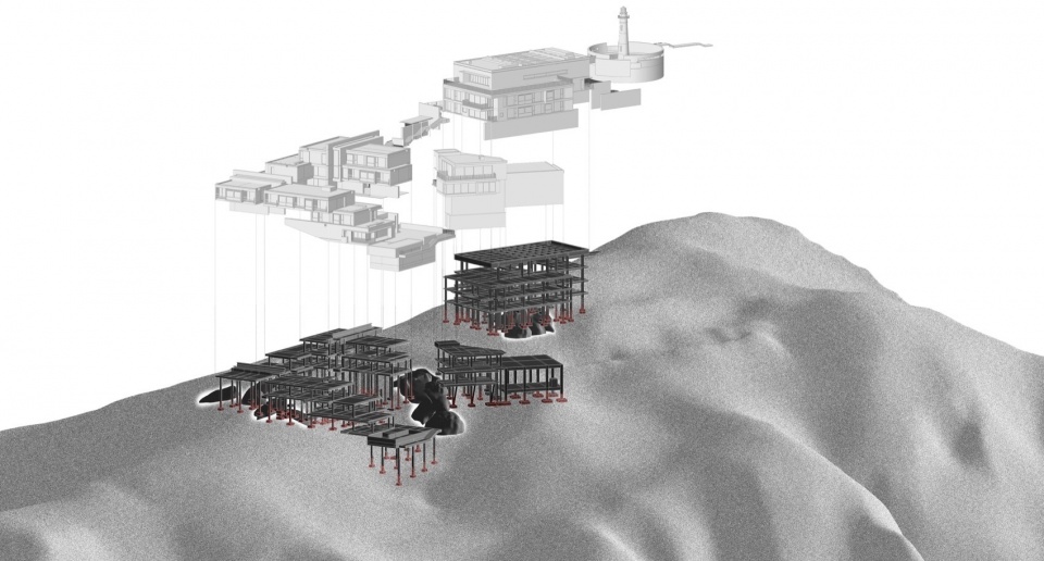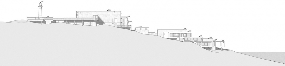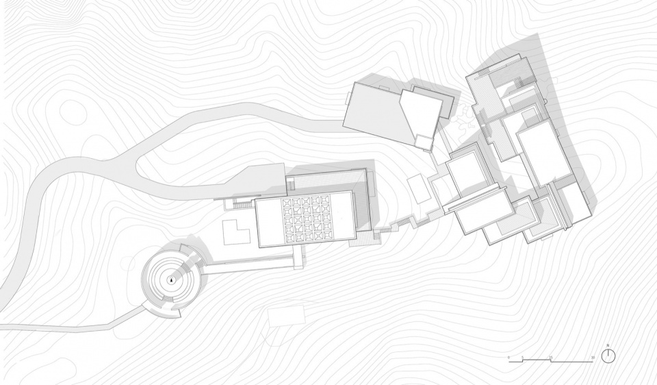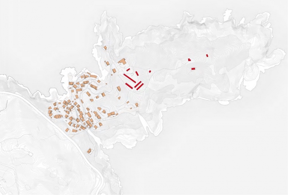 The architectural massing of the Lighthouse Hotel is organized according to the distribution of reefs and the steep terrain within the site, decomposed into a series of staggered, stepped modules. This stepped layout strategically adapts to the slope of the mountain and generates multi-angle views of the landscape.The massing and form of the building complex respond to the texture of the adjacent existing primitive residential settlements.