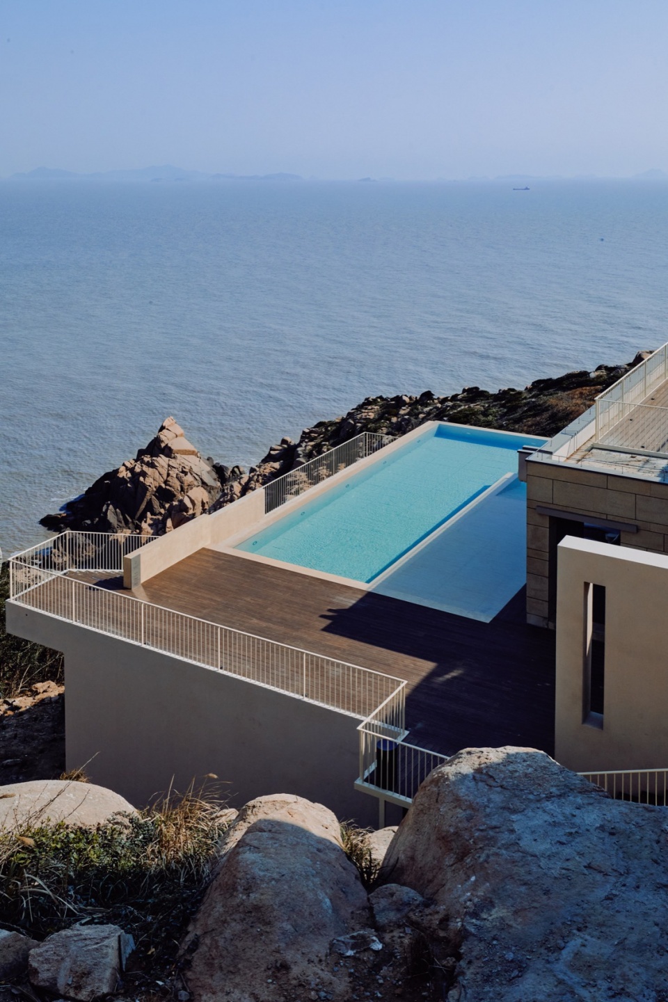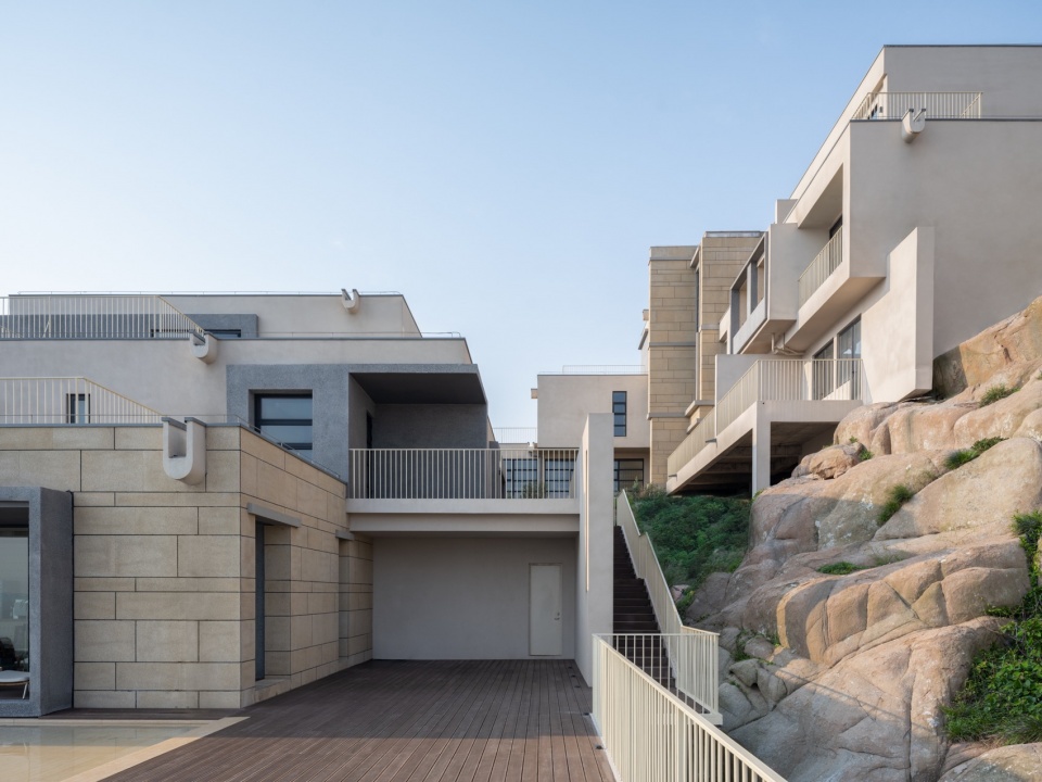 现代建筑的体量与原始的礁石之间是另一种呼应关系。设计采用独立基础,将实体空间悬挑在礁石之上,将重量感进一步削弱。同时,建筑平滑的底面和礁石粗粝转折的表面形成充满特色的灰空间,给景观增加了趣味性。