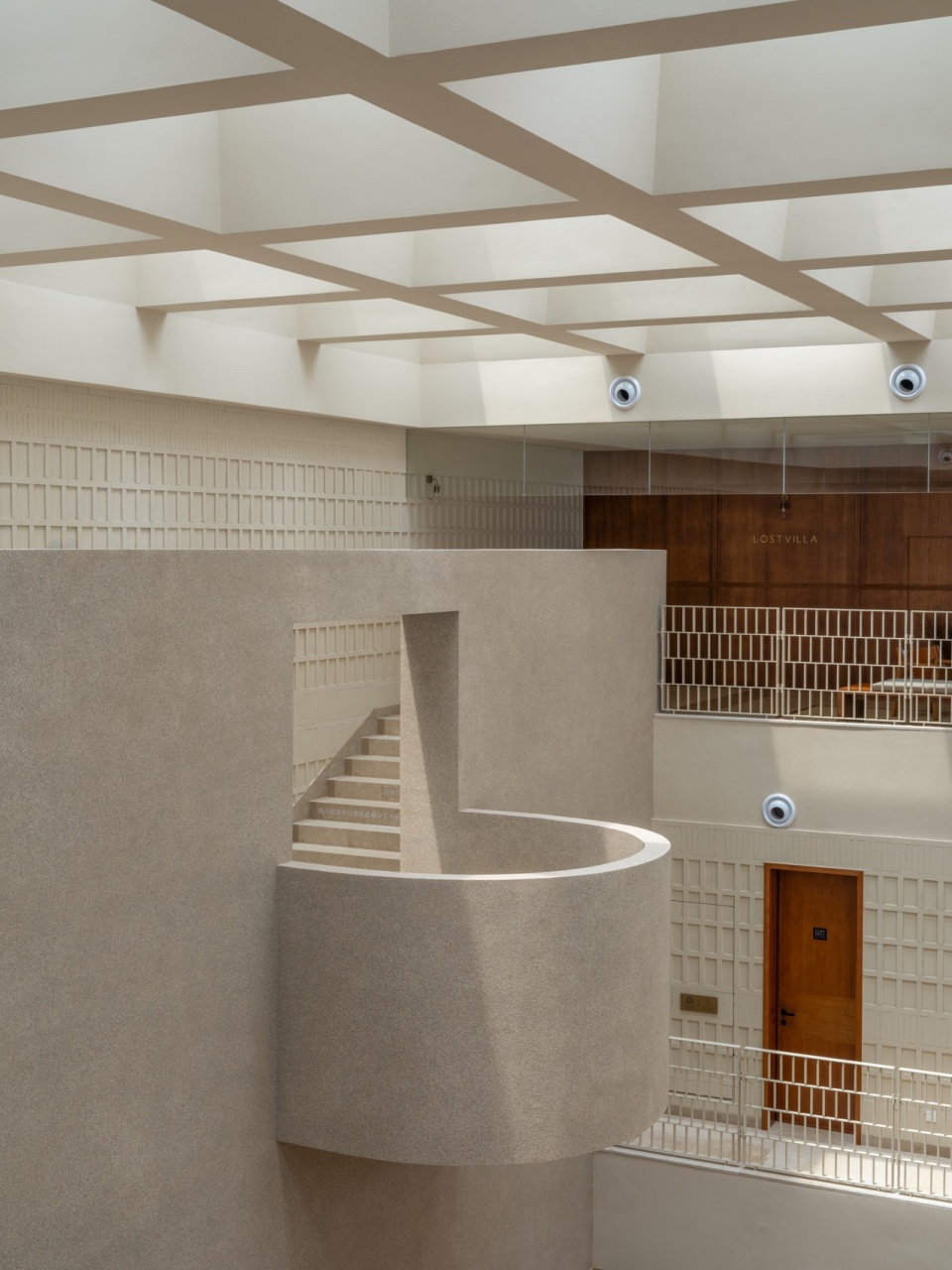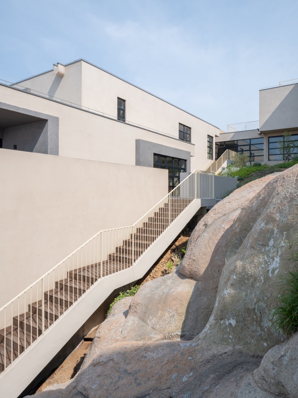 The building complex conforms to the steep mountain terrain, with only two relatively flat rock formations. The core area of the hotel is naturally divided into two groups, connected by an outdoor walkway that naturally descends along the mountain ridge. The design uses a sensory rhythm of “hidden-peek-open” and multiple transformations between “outdoor-indoor” and “indoor-outdoor” to represent the original experience of traveling across the island. The design of the route carefully considers the rhythm of spatial sequences from a first-person perspective—the walkway follows the contours of the reef, while the use of partition walls creates a sense of anticipation as the architectural space gradually reveals itself. Halfway along the route, scattered windows reveal fragments of light and shadow from the sea and sky, creating a sense of “peeping”; finally, the path leads through a spiral staircase to a wide outdoor walkway, where the view suddenly opens up—the boundless blue sea and magnificent reefs spread out like a painting, and a moment of “openess” unfolds before your eyes.
